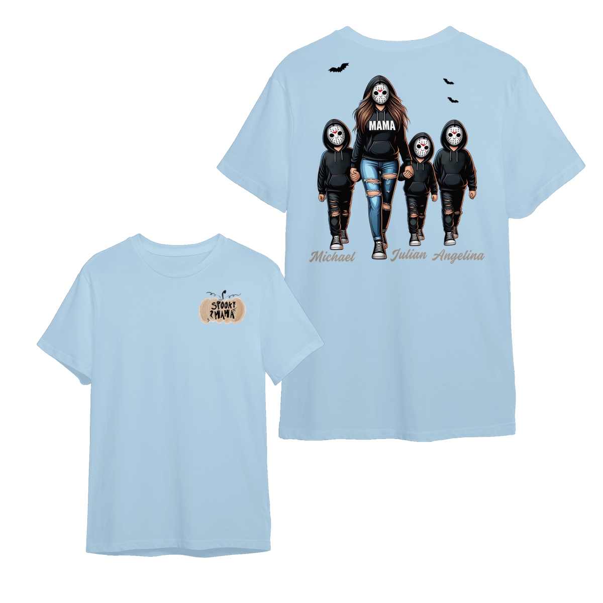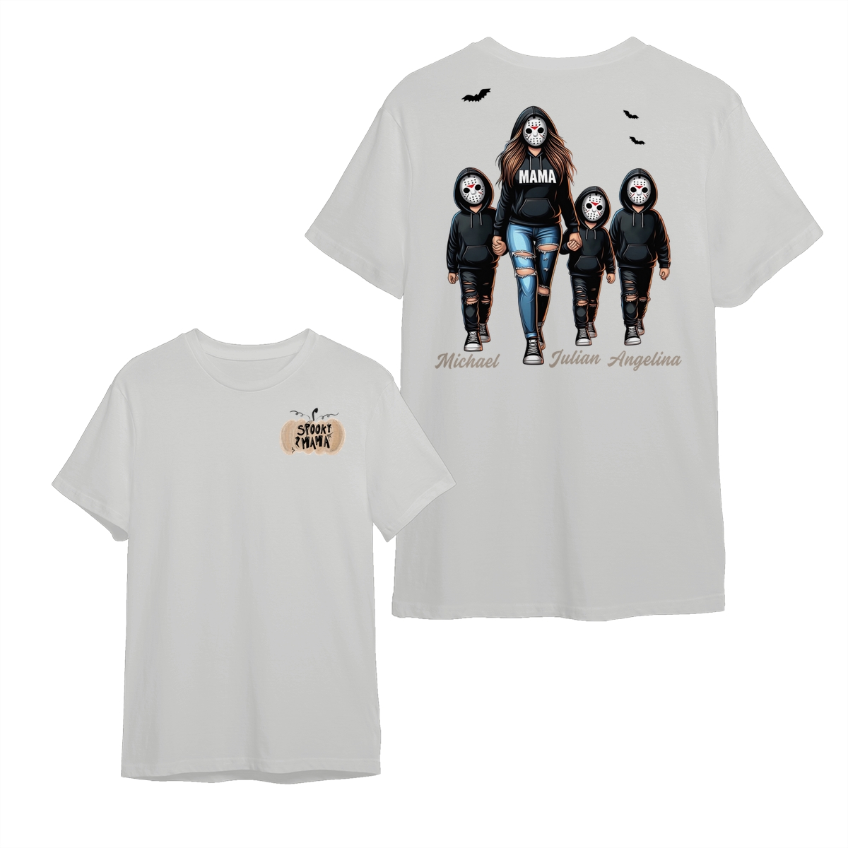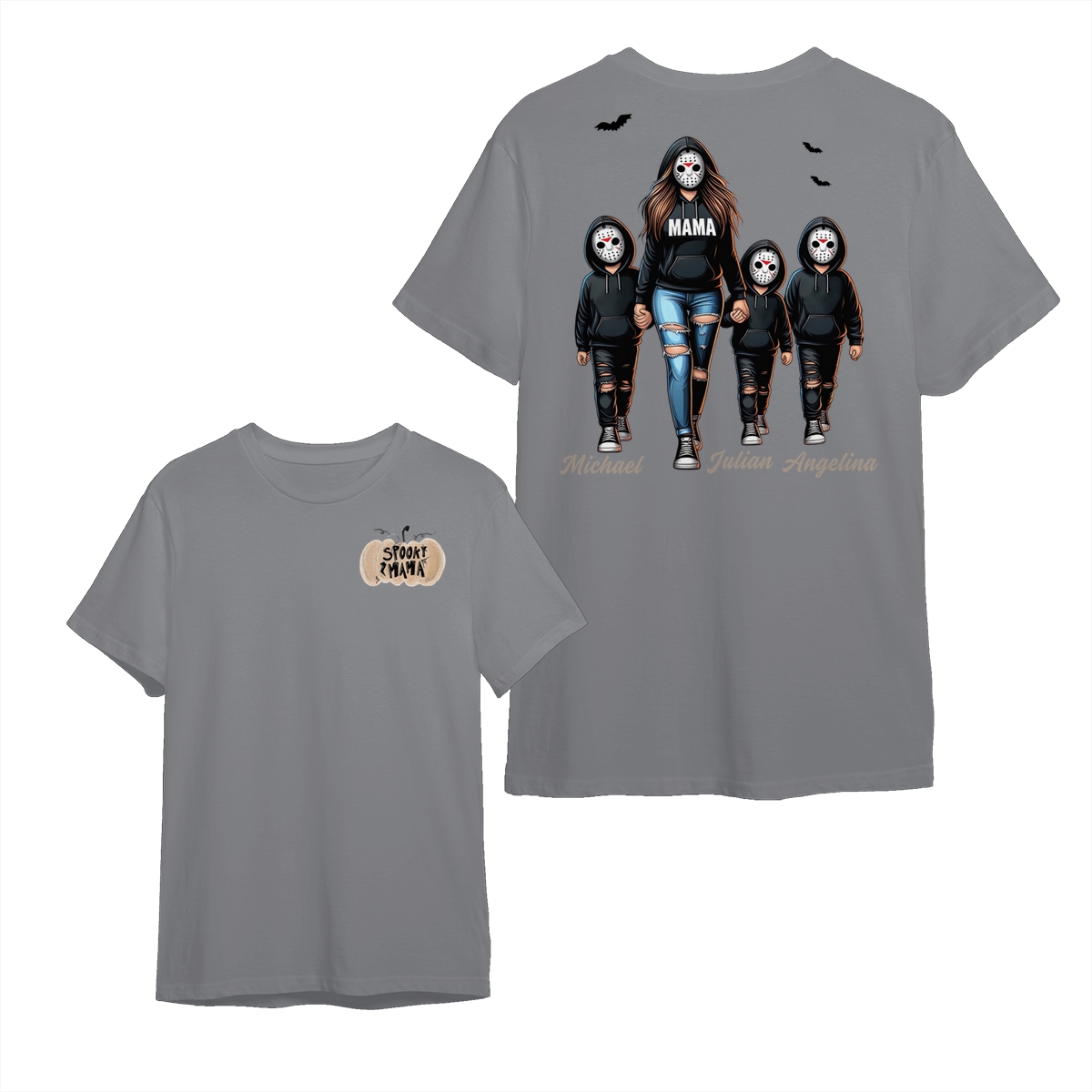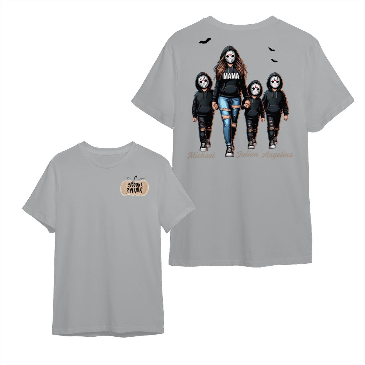 Spooky Mama Halloween Shirt – Custom Family Graphic with Mom and Kids in Masks, Matching Halloween Outfit, Gift for Spooky Season Menswear Tops
