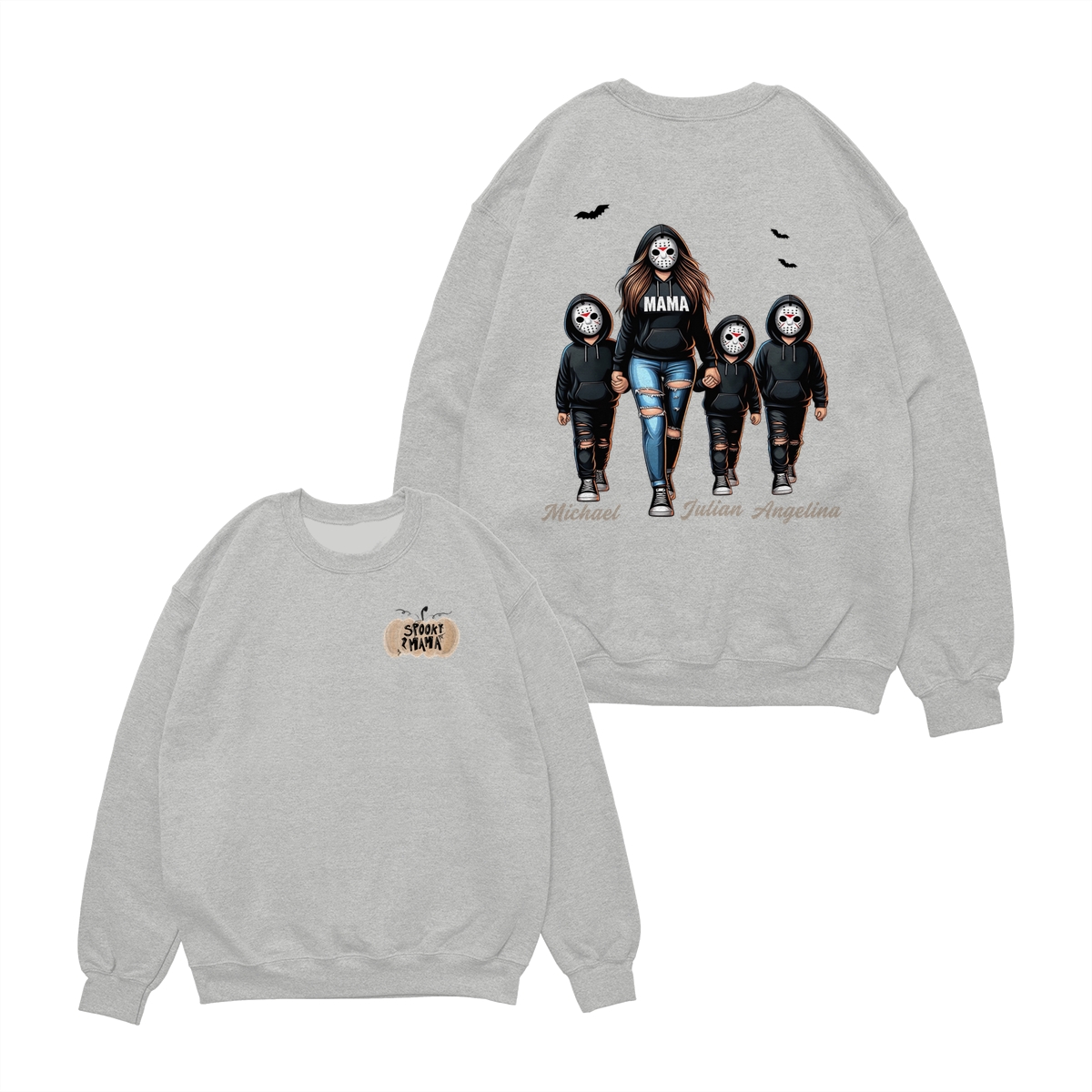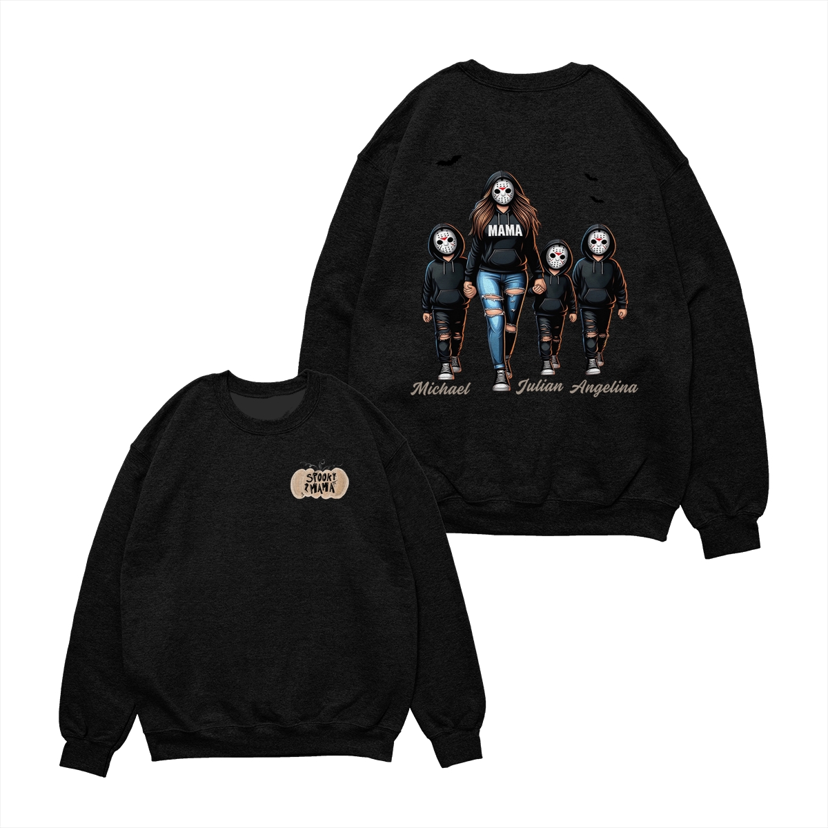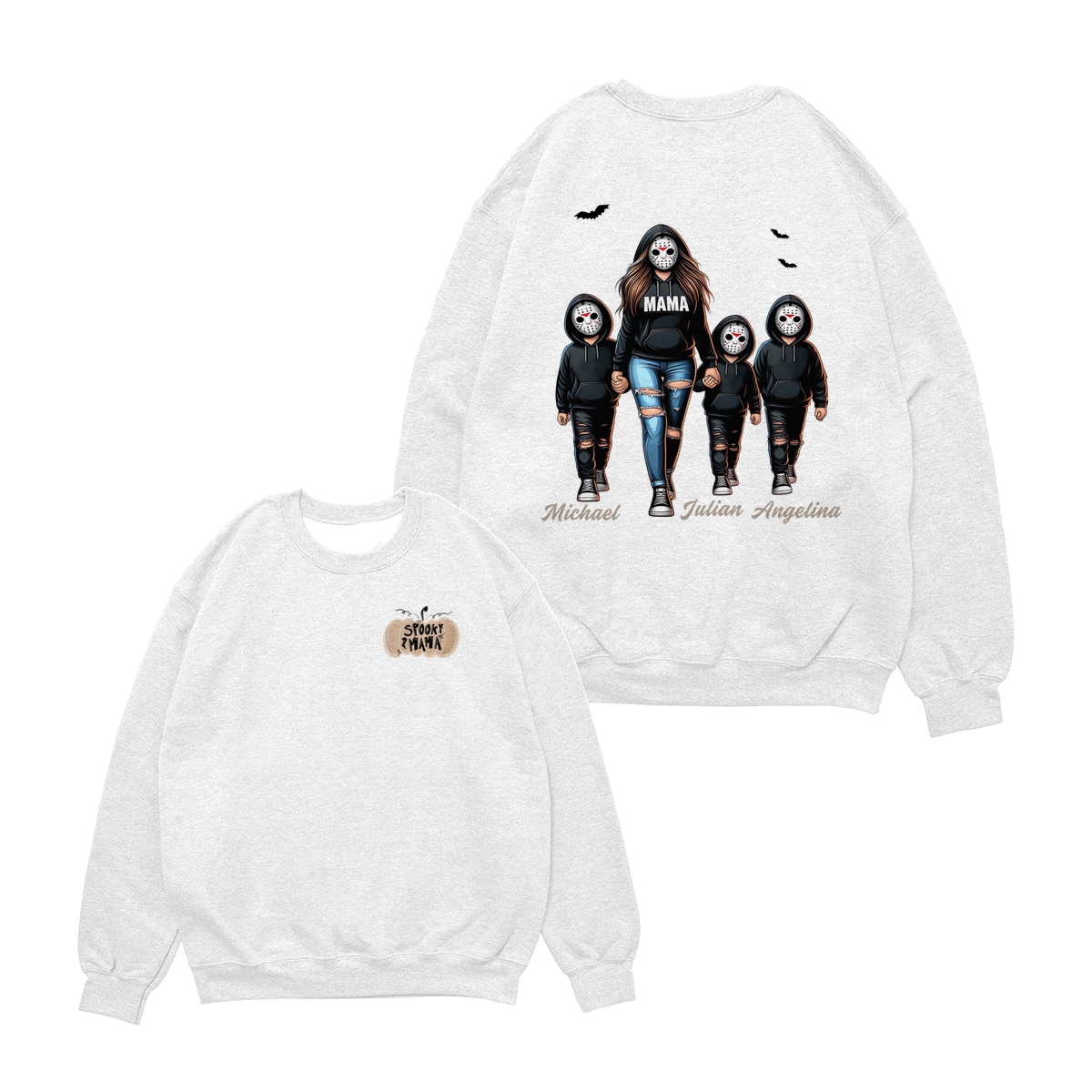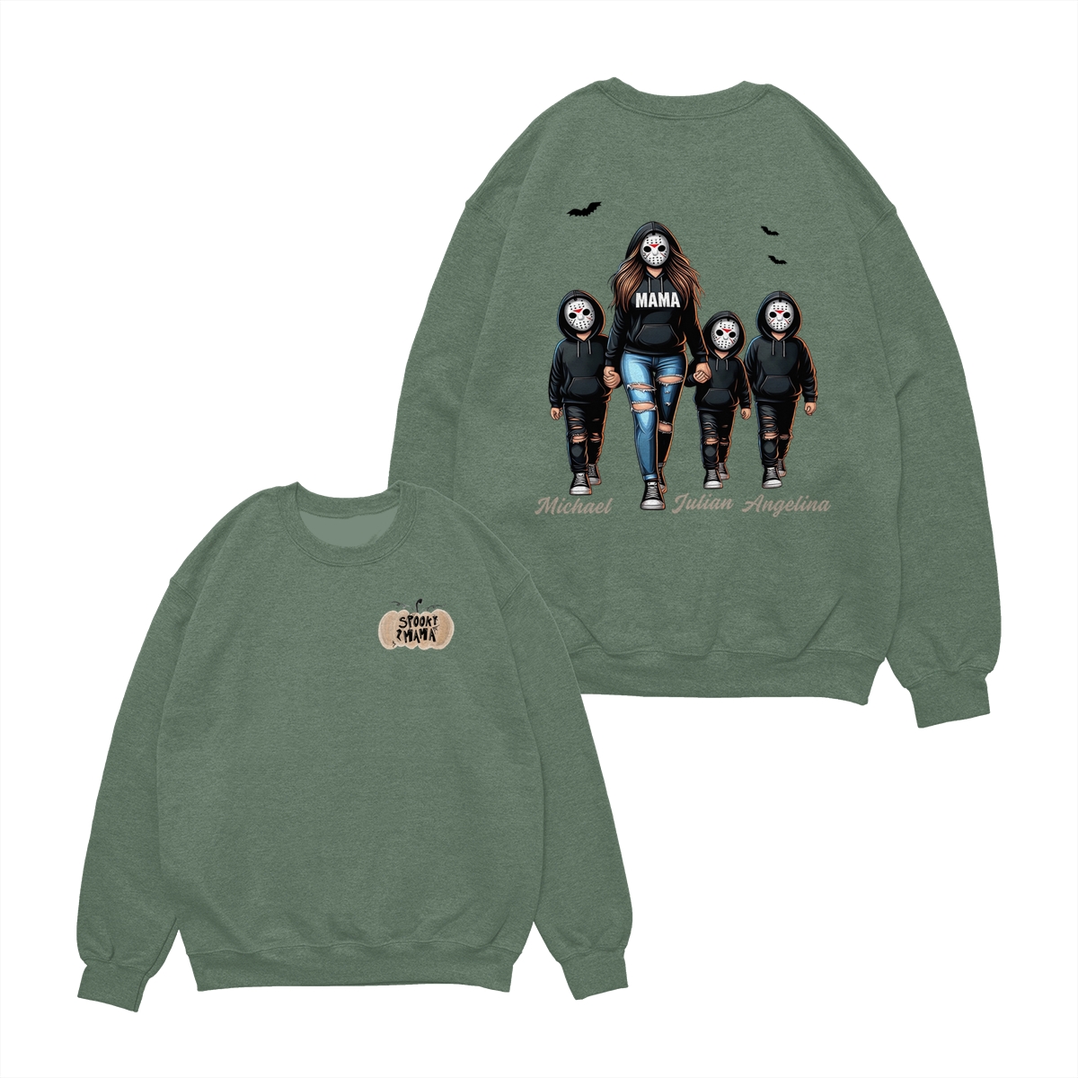 Spooky Mama Halloween Shirt – Custom Family Graphic with Mom and Kids in Masks, Matching Halloween Outfit, Gift for Spooky Season Menswear Tops