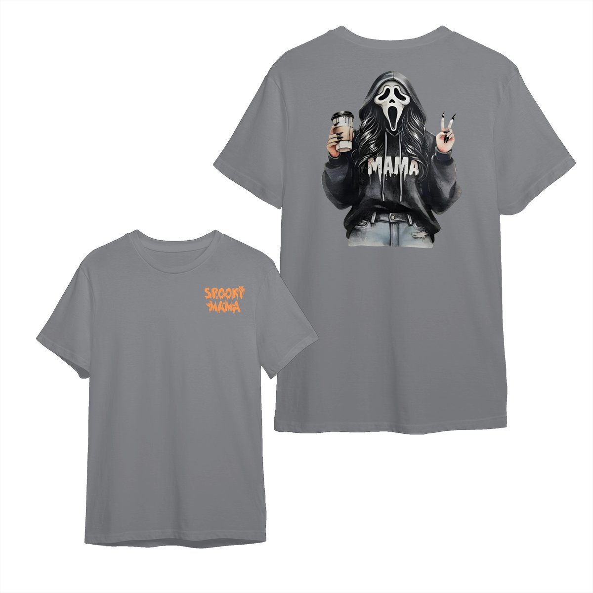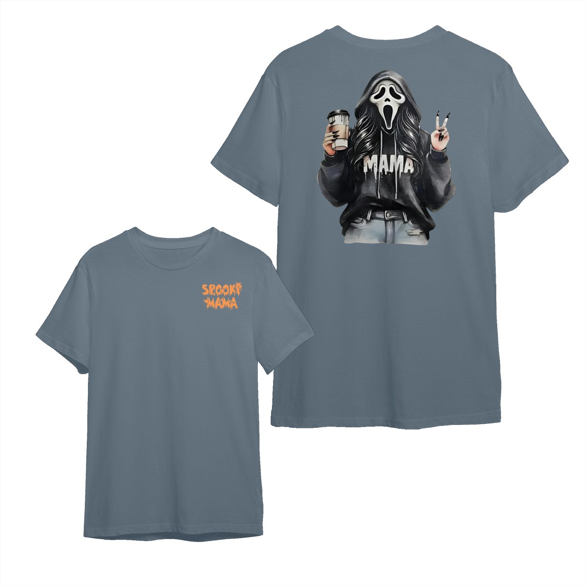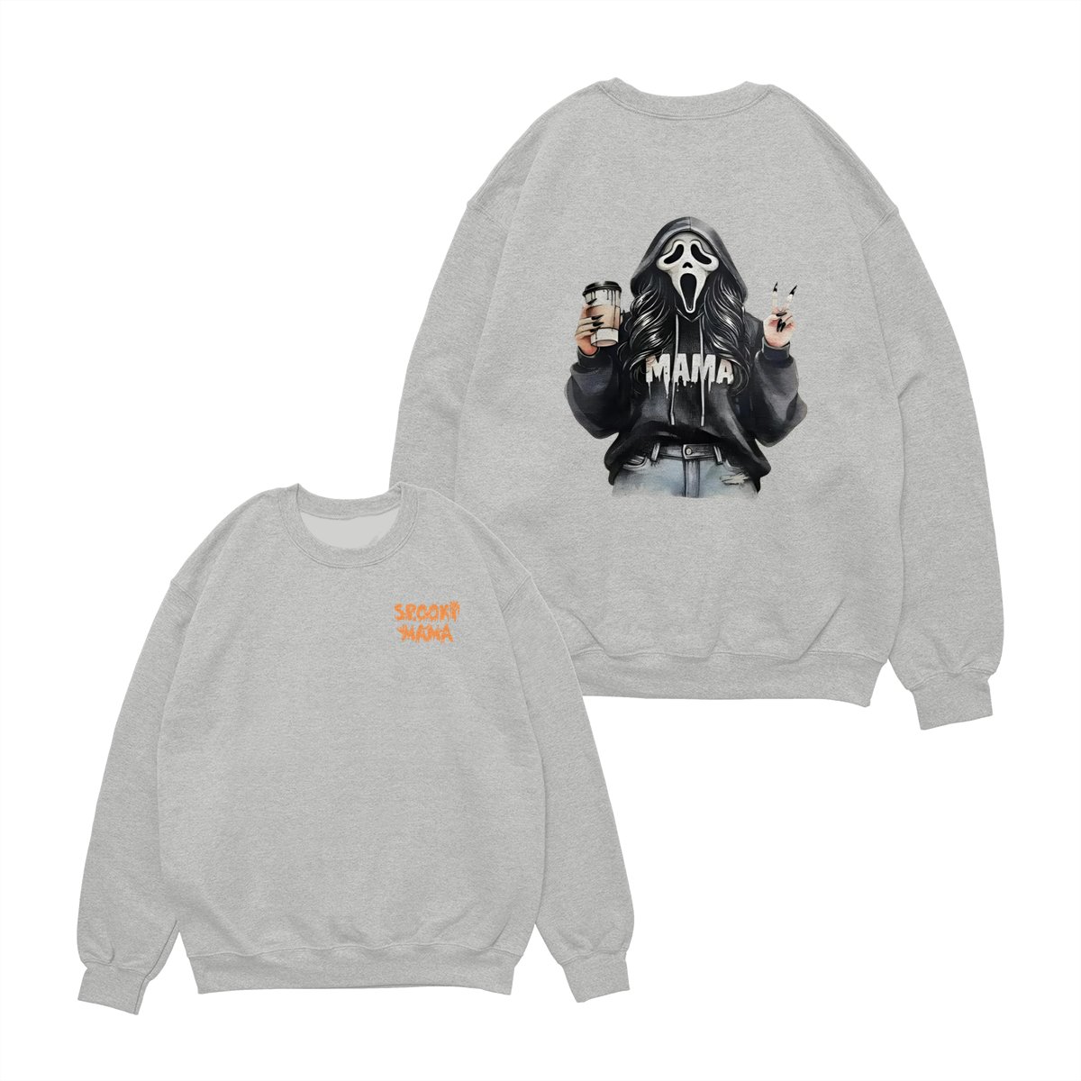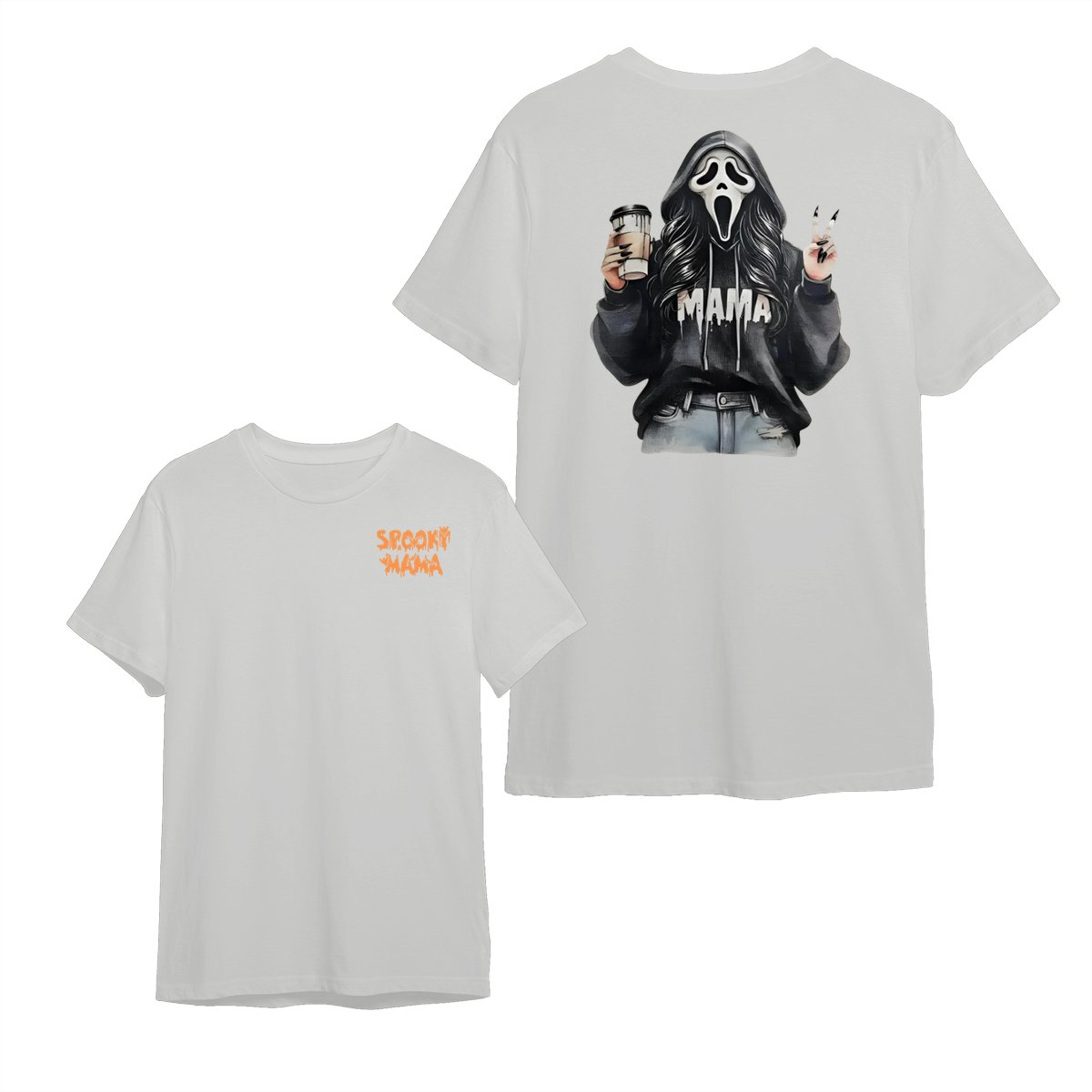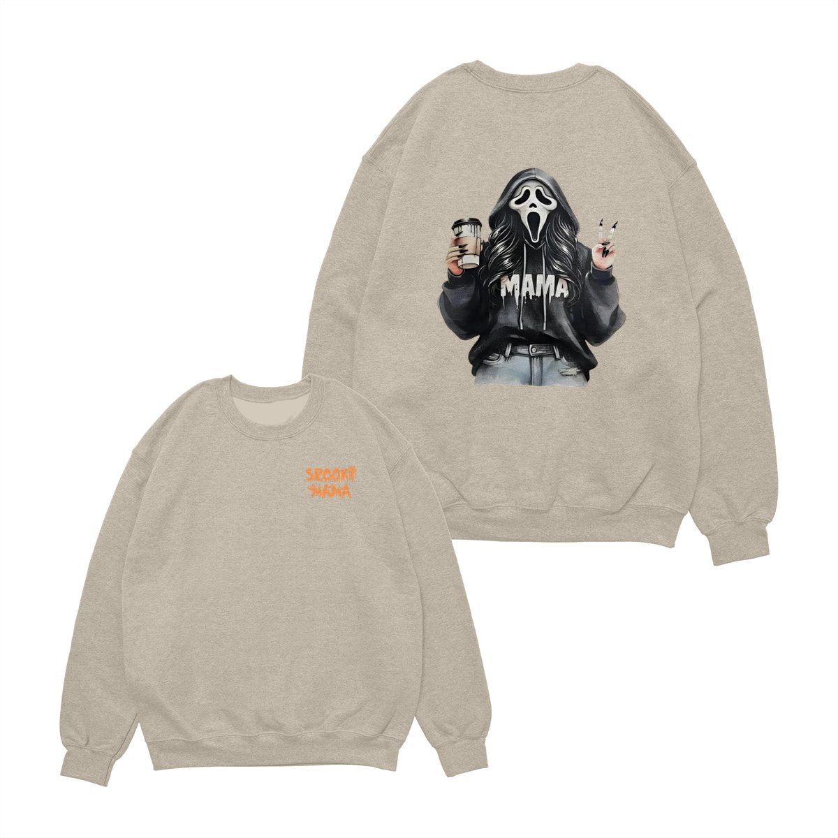 Spooky Mama Halloween Shirt, Ghostface Girl with Coffee Cup Graphic, Trendy Scary Mama Unisex Cotton Pullover for Women and Men, USA-Made & Printed Apparel