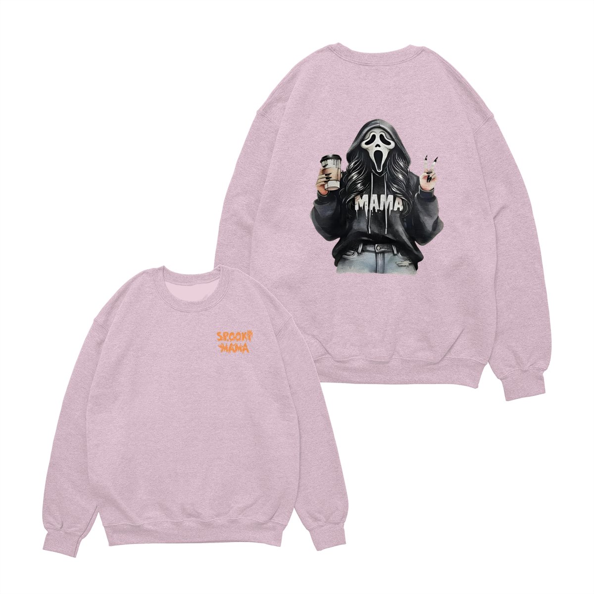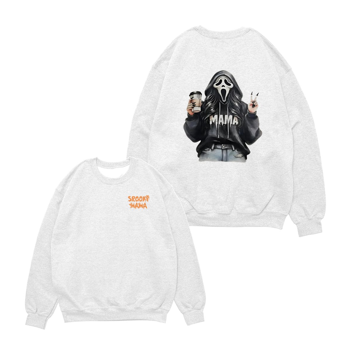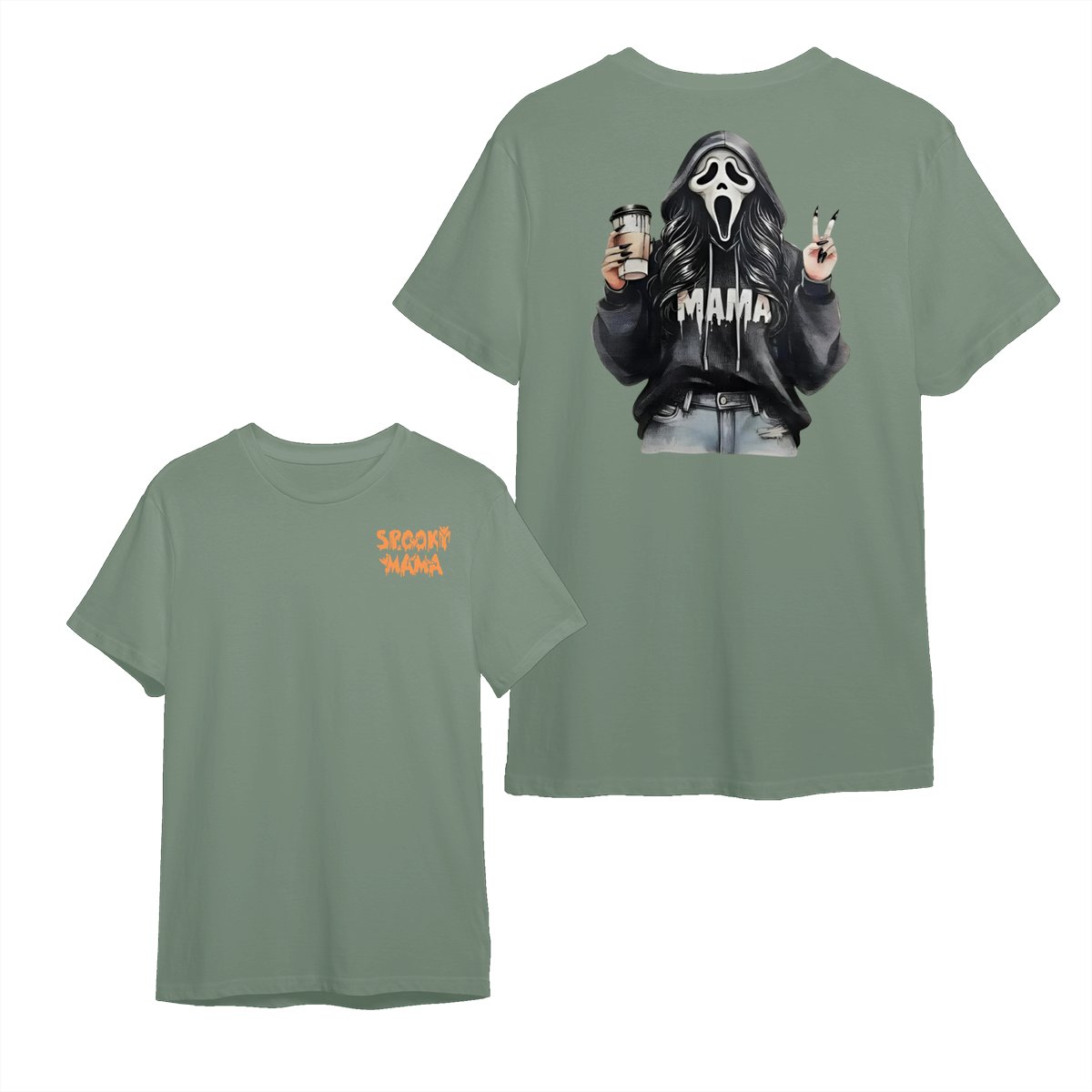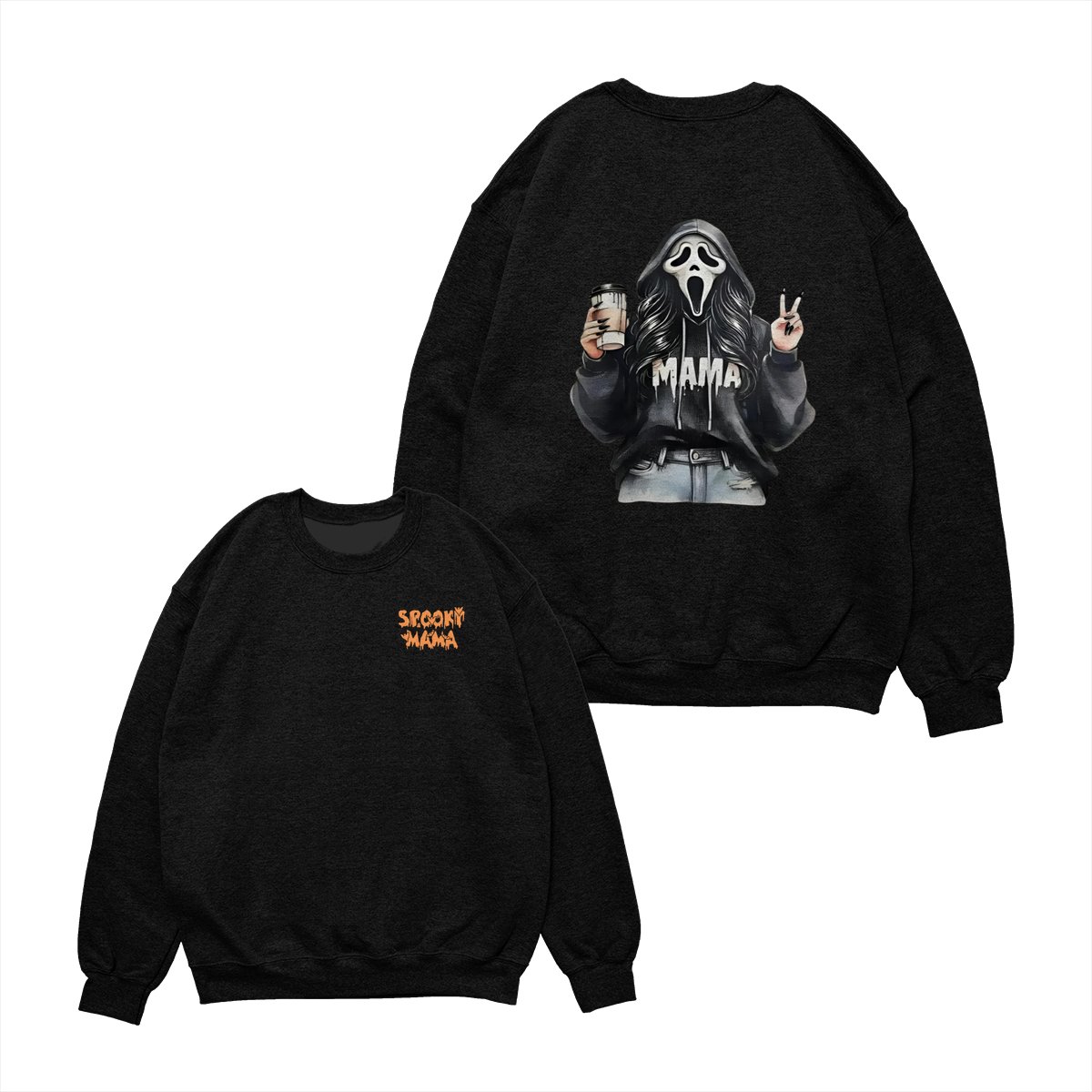 Spooky Mama Halloween Shirt, Ghostface Girl with Coffee Cup Graphic, Trendy Scary Mama Unisex Cotton Pullover for Women and Men, USA-Made & Printed Apparel