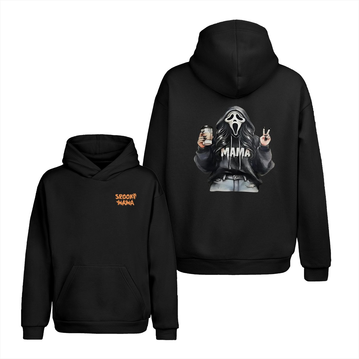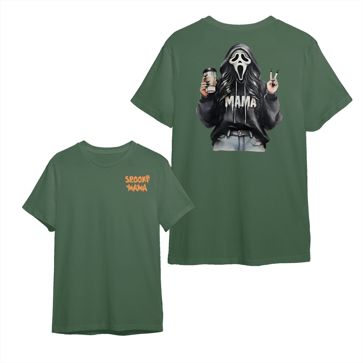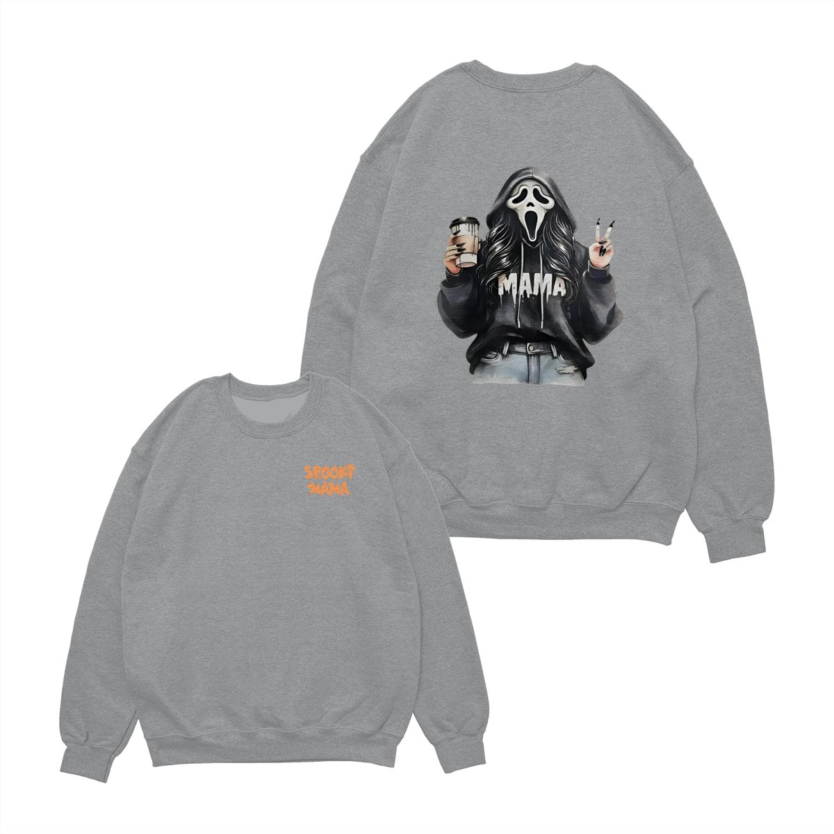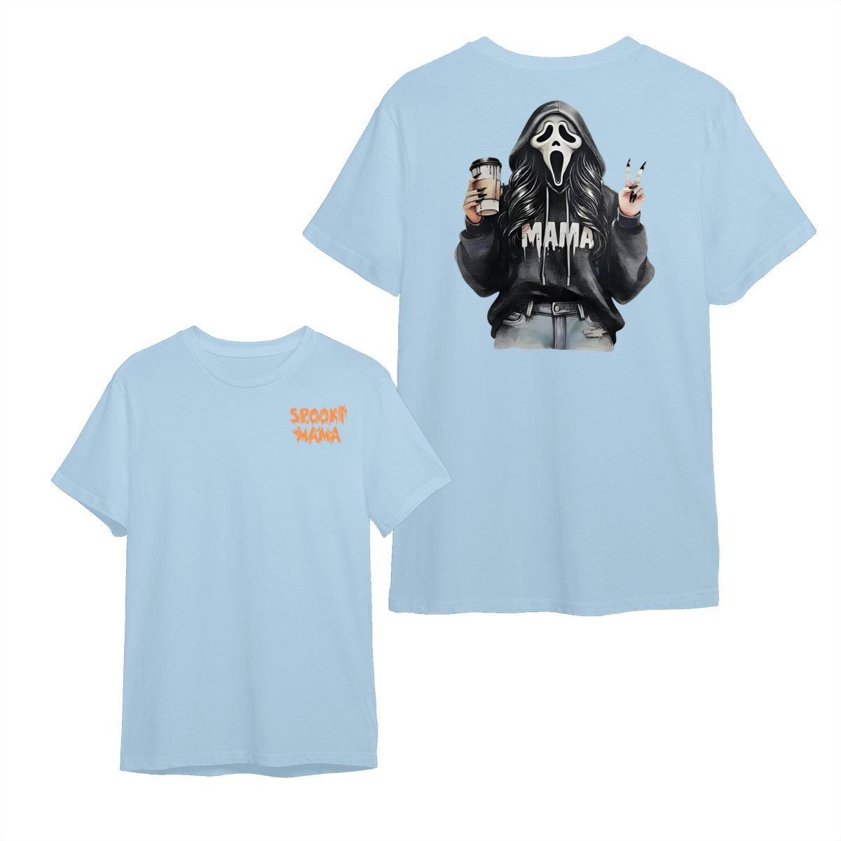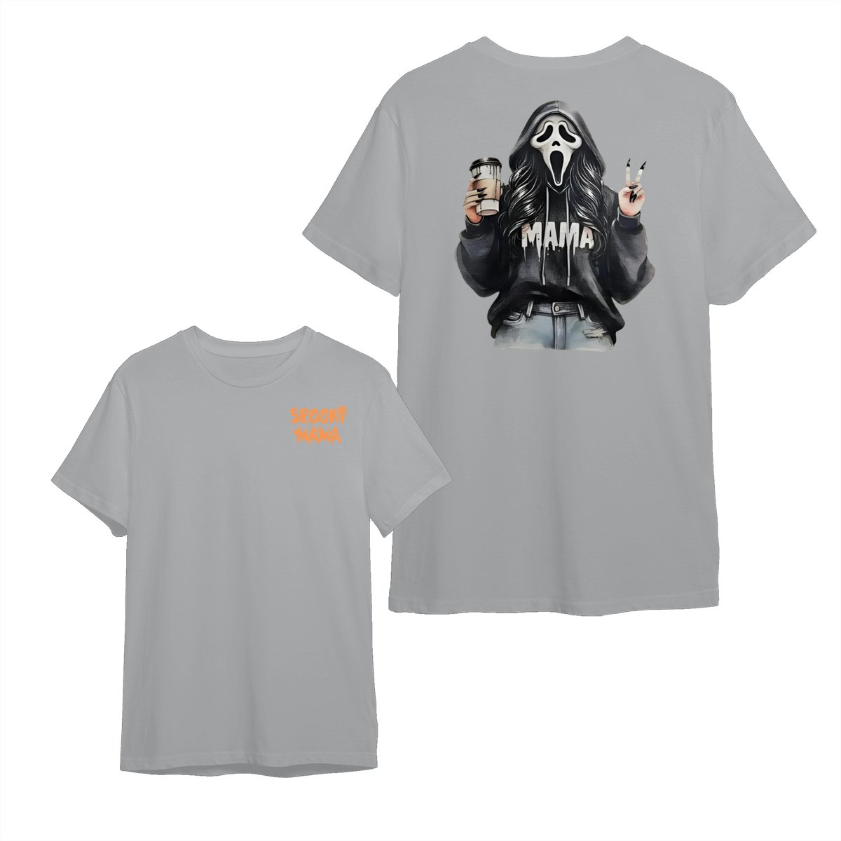 Spooky Mama Halloween Shirt, Ghostface Girl with Coffee Cup Graphic, Trendy Scary Mama Unisex Cotton Pullover for Women and Men, USA-Made & Printed Apparel