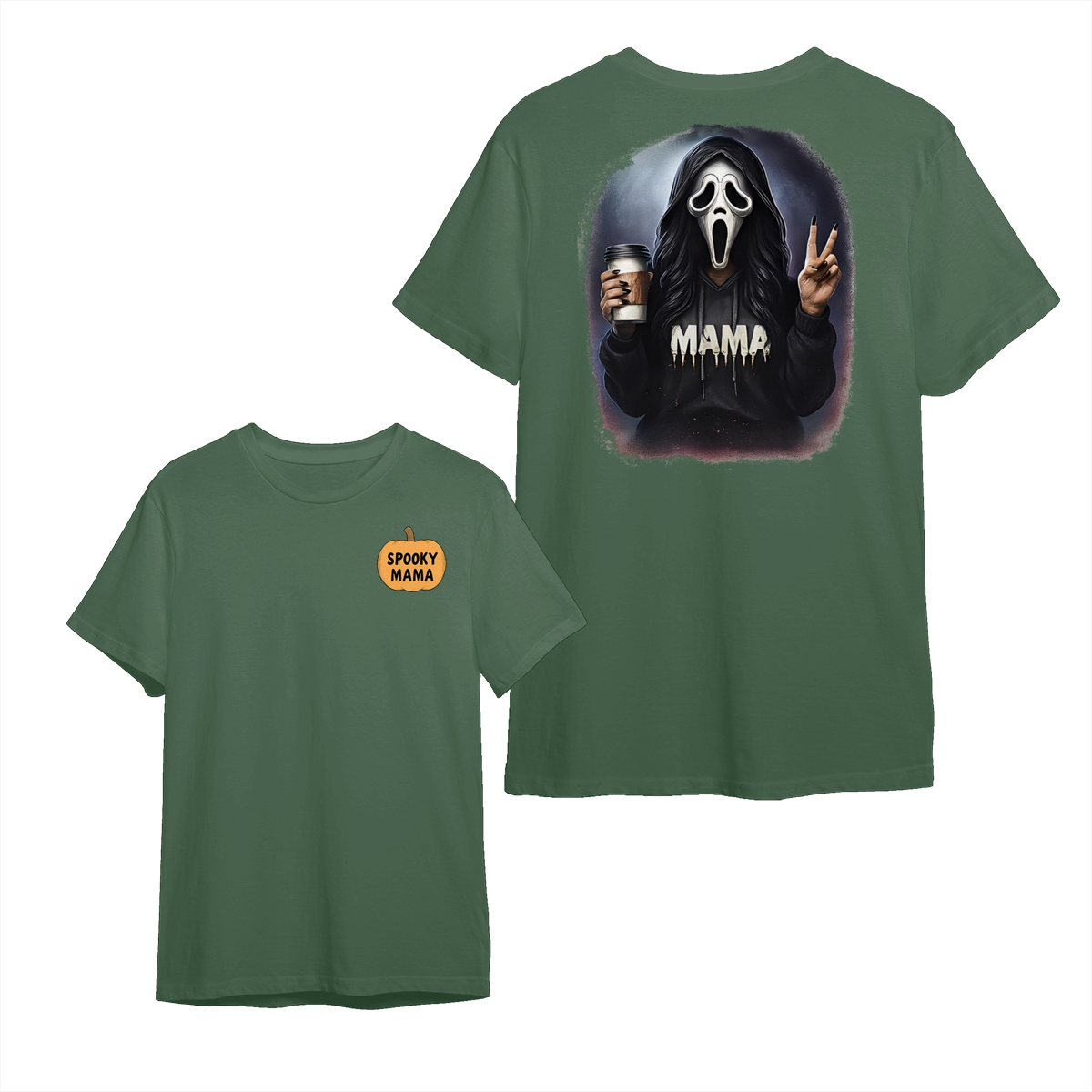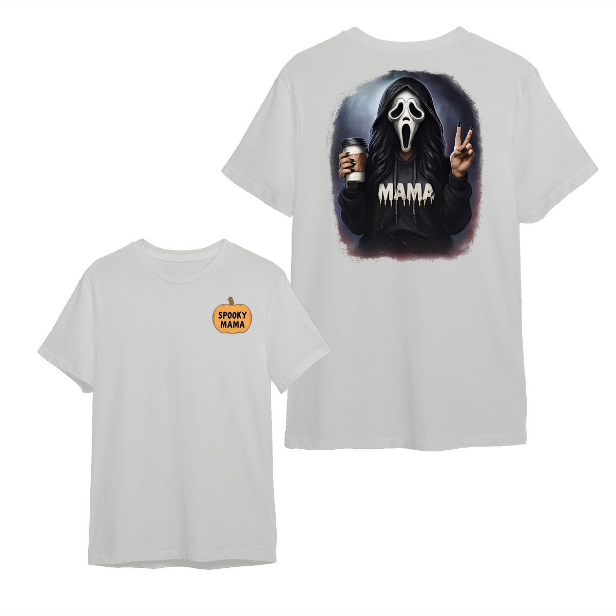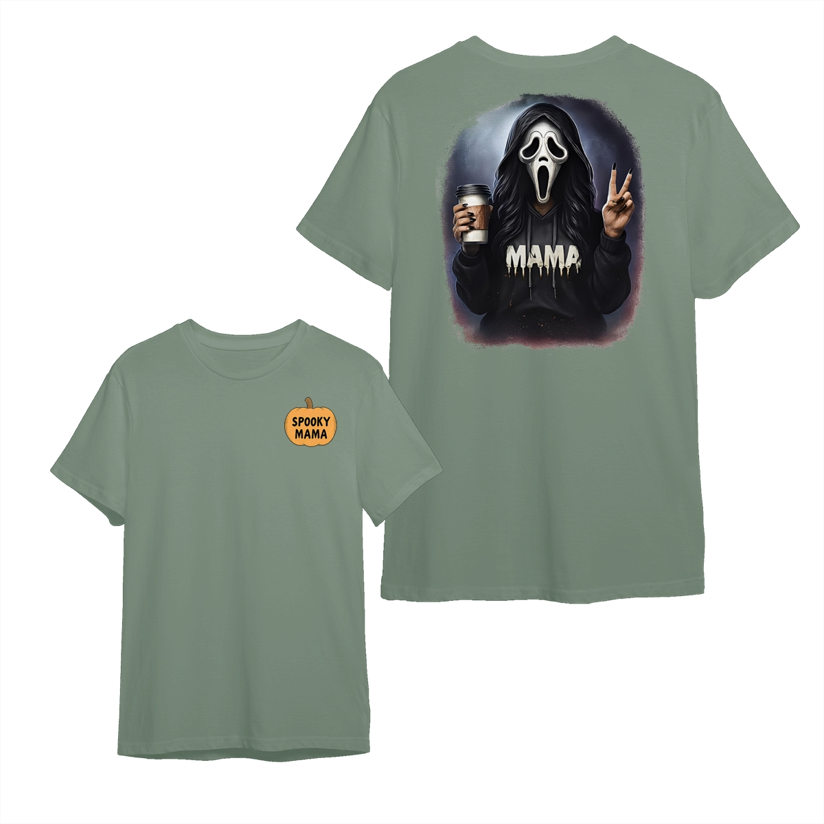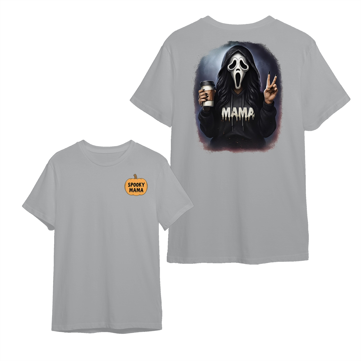 Spooky Mama Halloween T-Shirt, Scary Mask Graphic Tee with Coffee Cup, Horror Mom Shirt, Unisex Cotton Top, Fall Casual Outfit