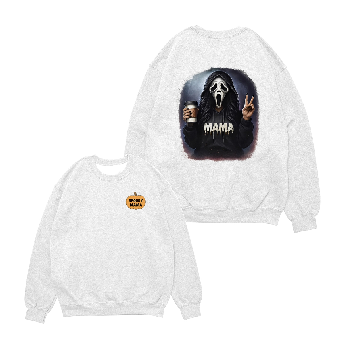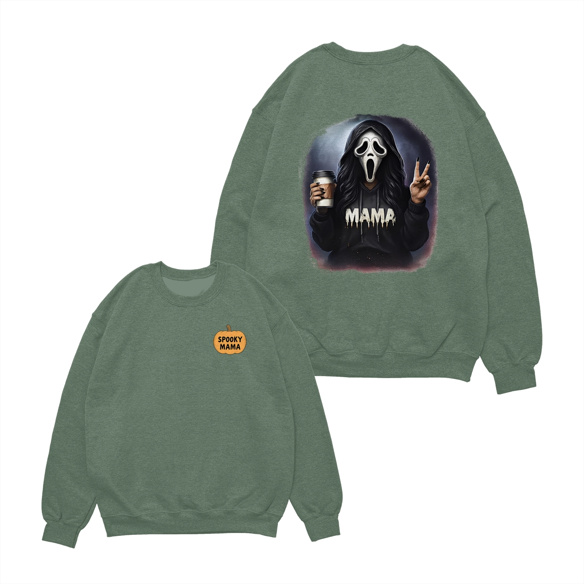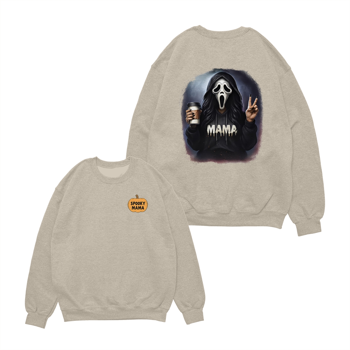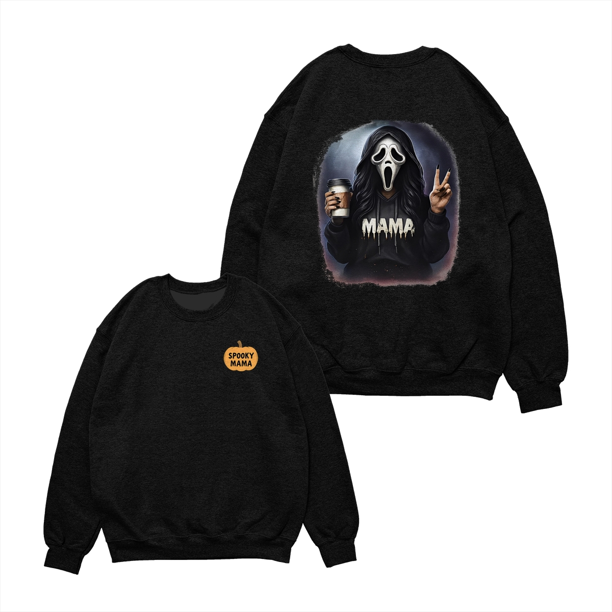 Spooky Mama Halloween T-Shirt, Scary Mask Graphic Tee with Coffee Cup, Horror Mom Shirt, Unisex Cotton Top, Fall Casual Outfit