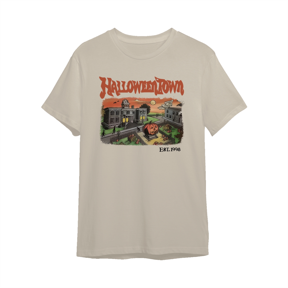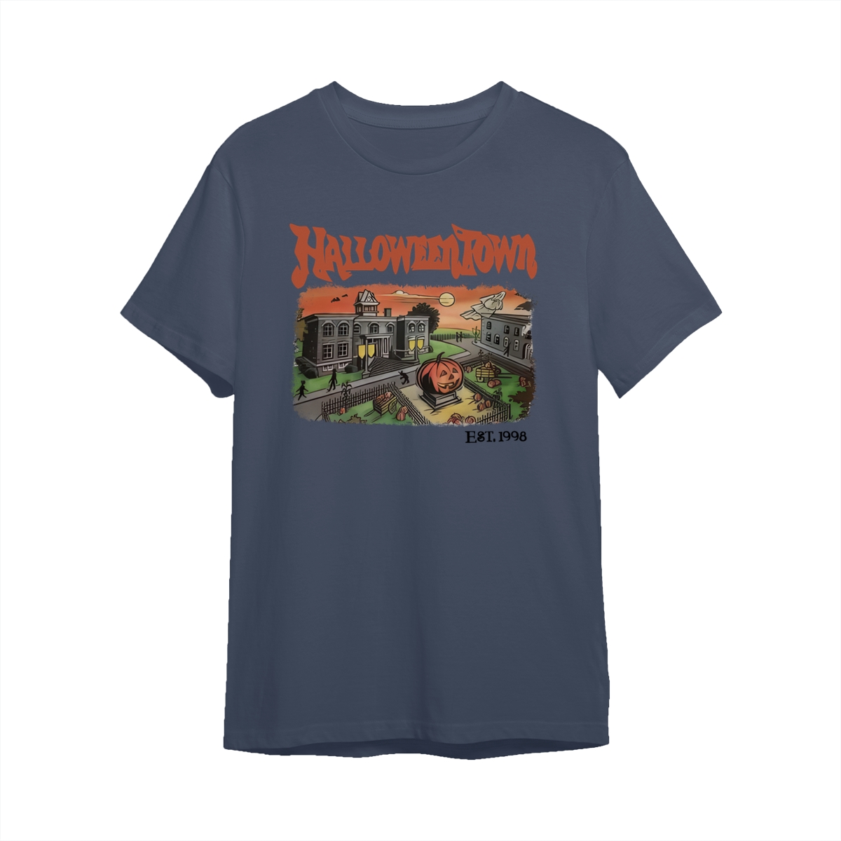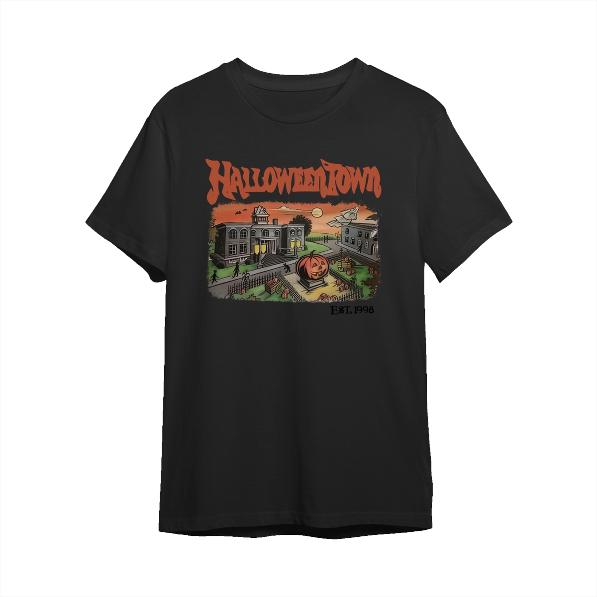 Spooky Village Sweatshirt – Vintage Haunted Town Graphic With Pumpkin Statue , Fall Street Scene Illustration , Cozy Pullover For Autumn , Soft Fabric , Unisex Style , Great Gift For Fall Fans Crewneck