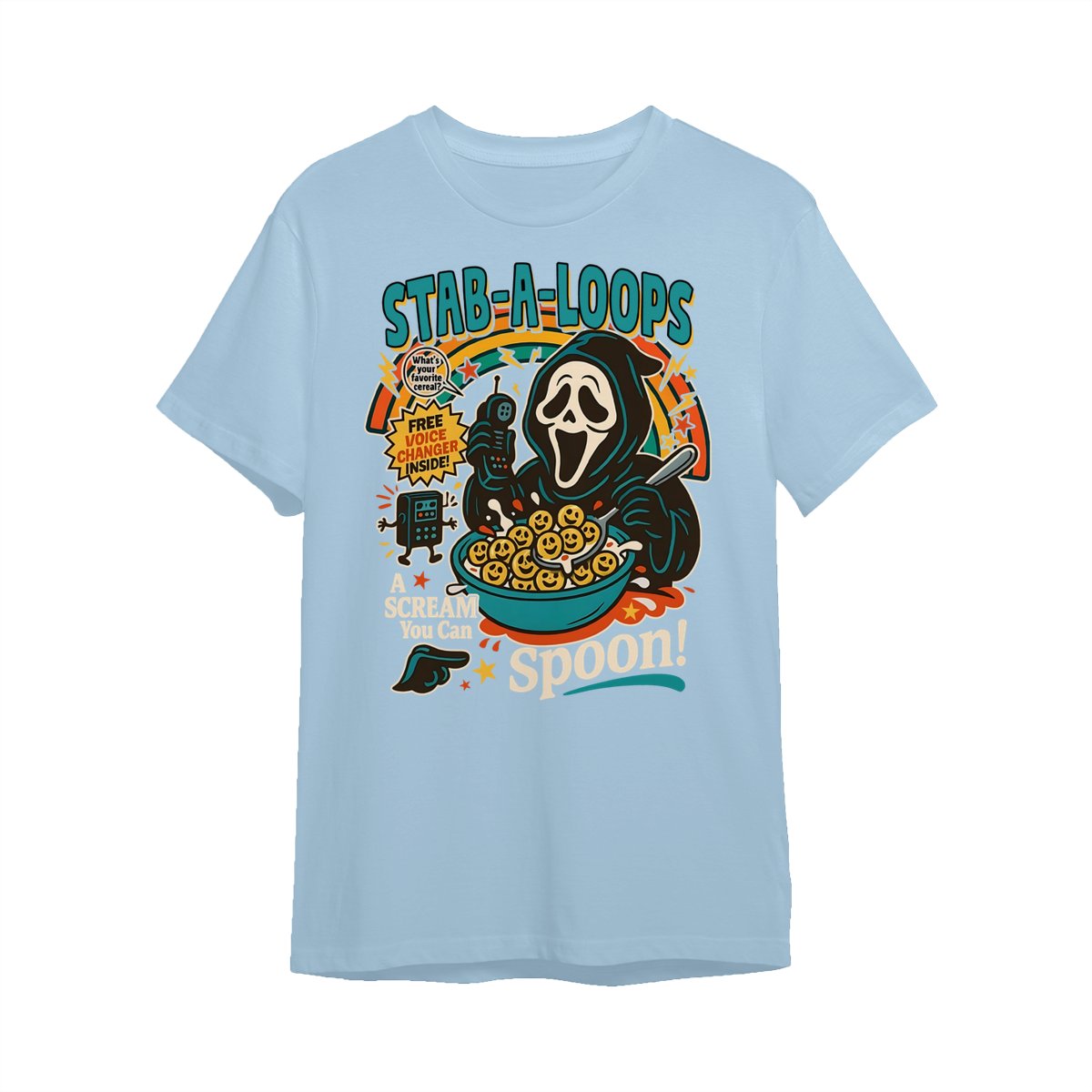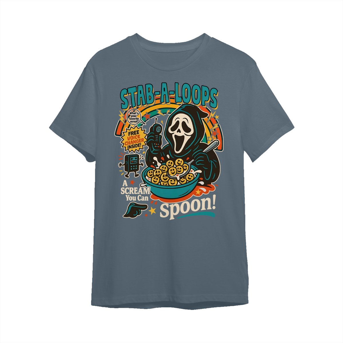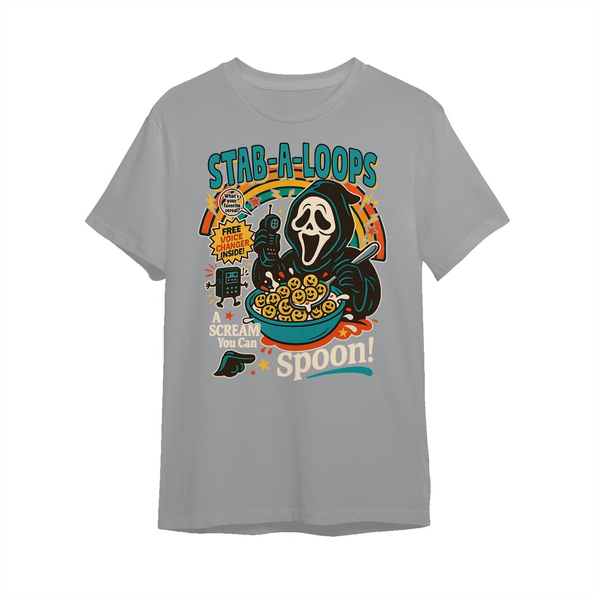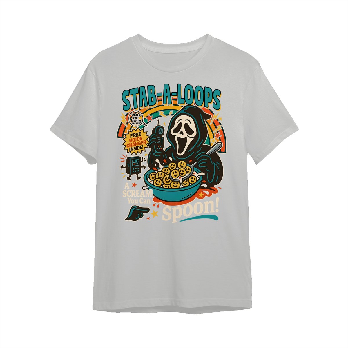 Stab-A-Loops T-Shirt – Funny Horror Cereal Graphic Tee with Scream Mask & Spoon Design | Halloween Trend Shirt for Movie & Meme Fans