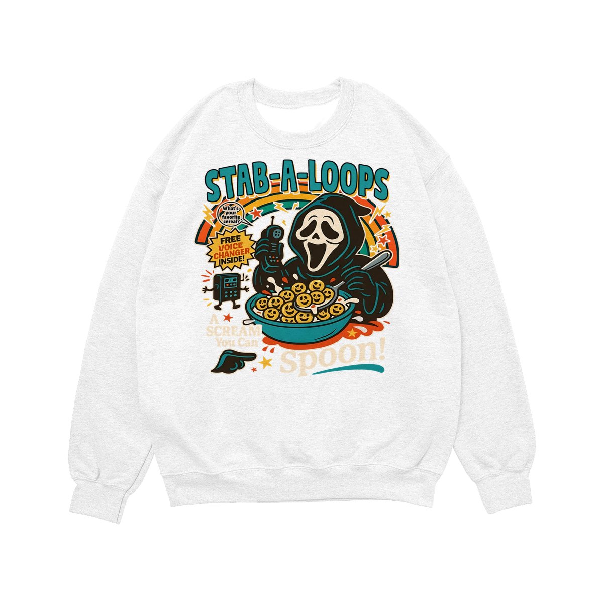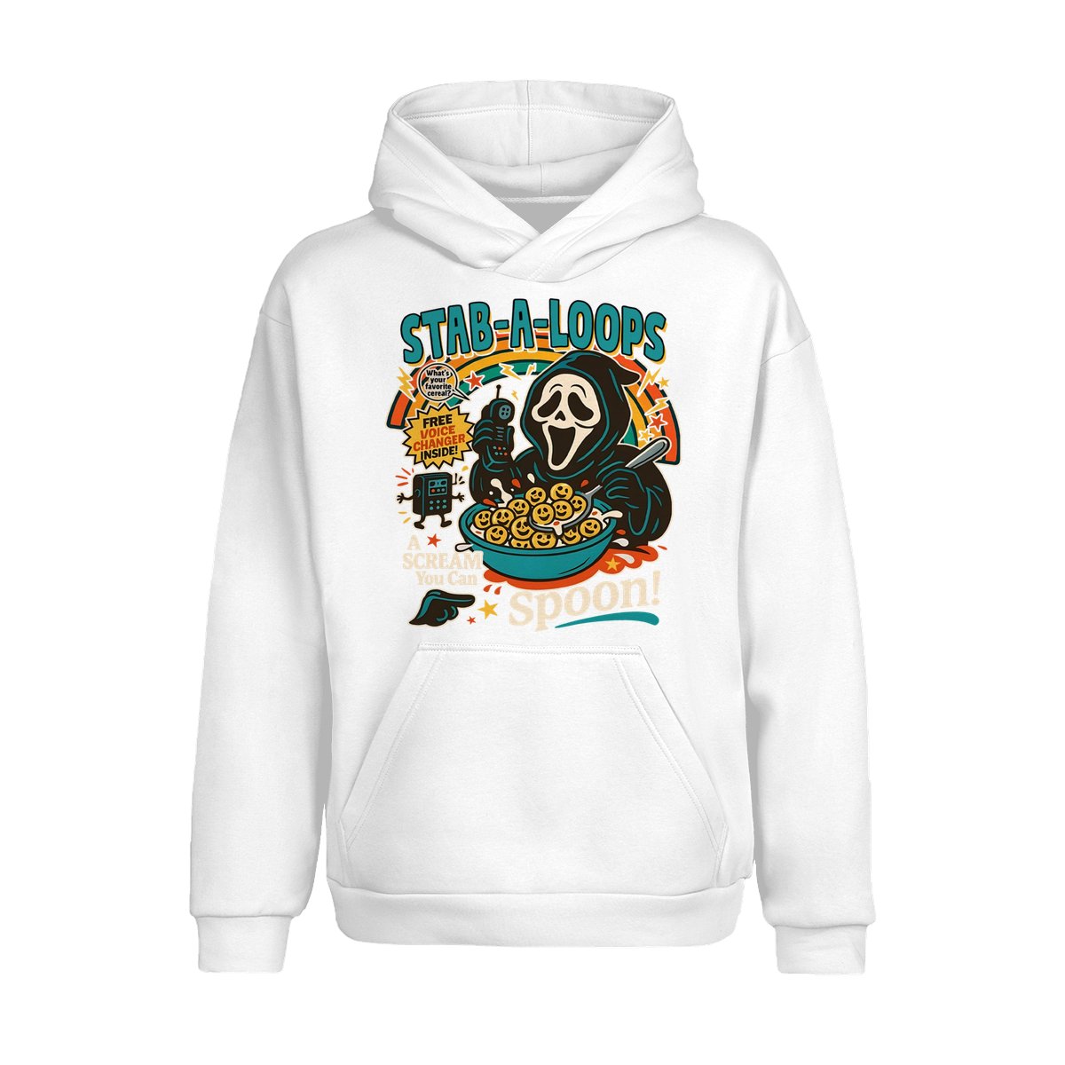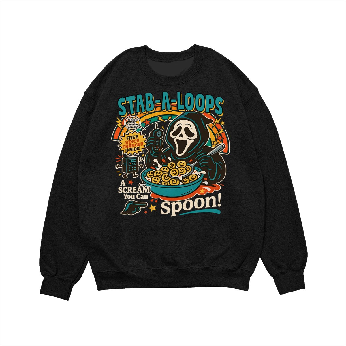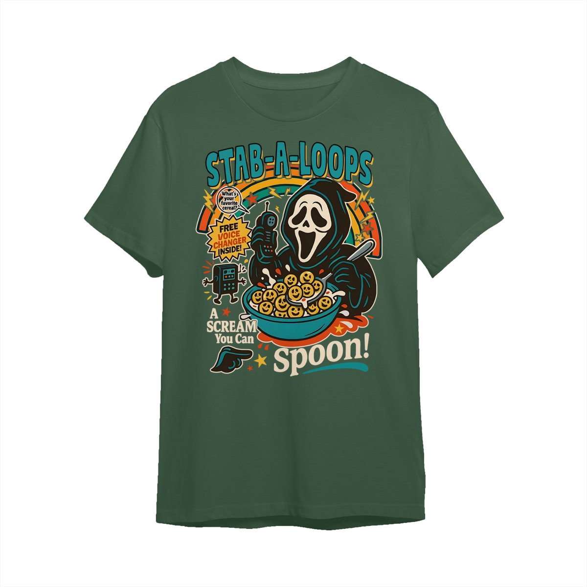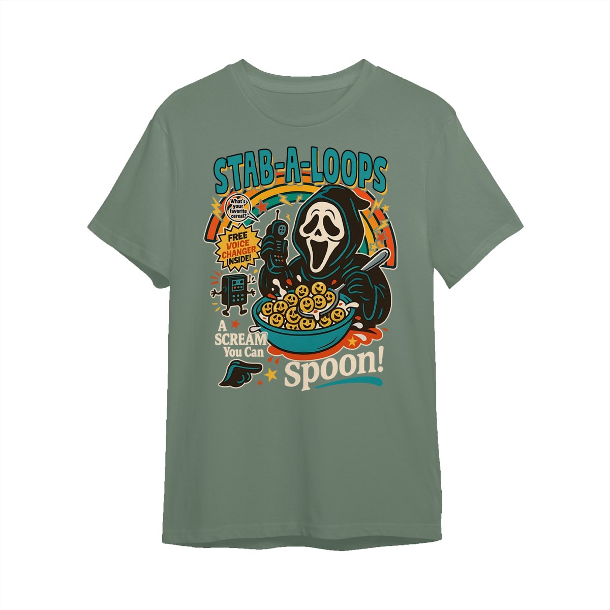 Stab-A-Loops T-Shirt – Funny Horror Cereal Graphic Tee with Scream Mask & Spoon Design | Halloween Trend Shirt for Movie & Meme Fans