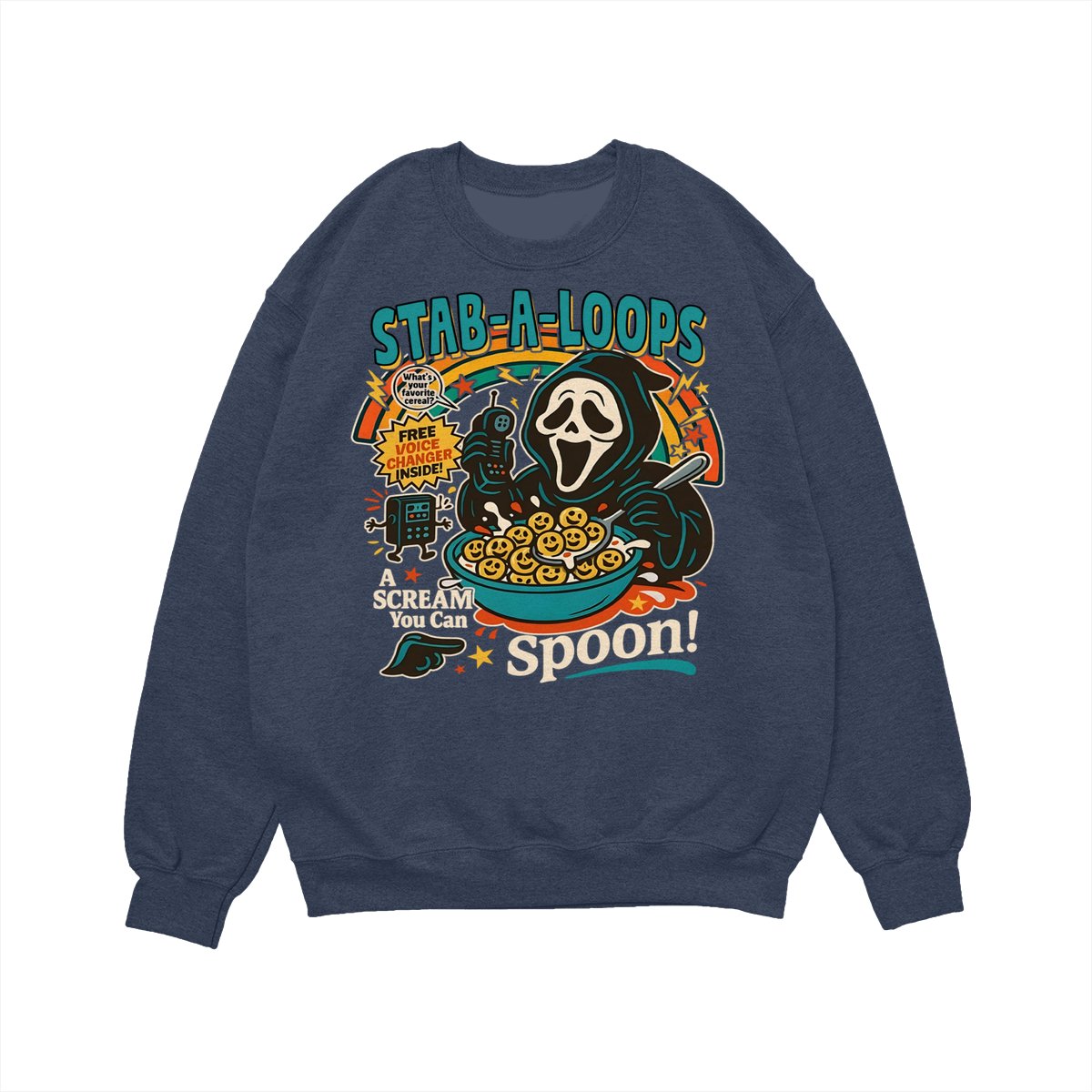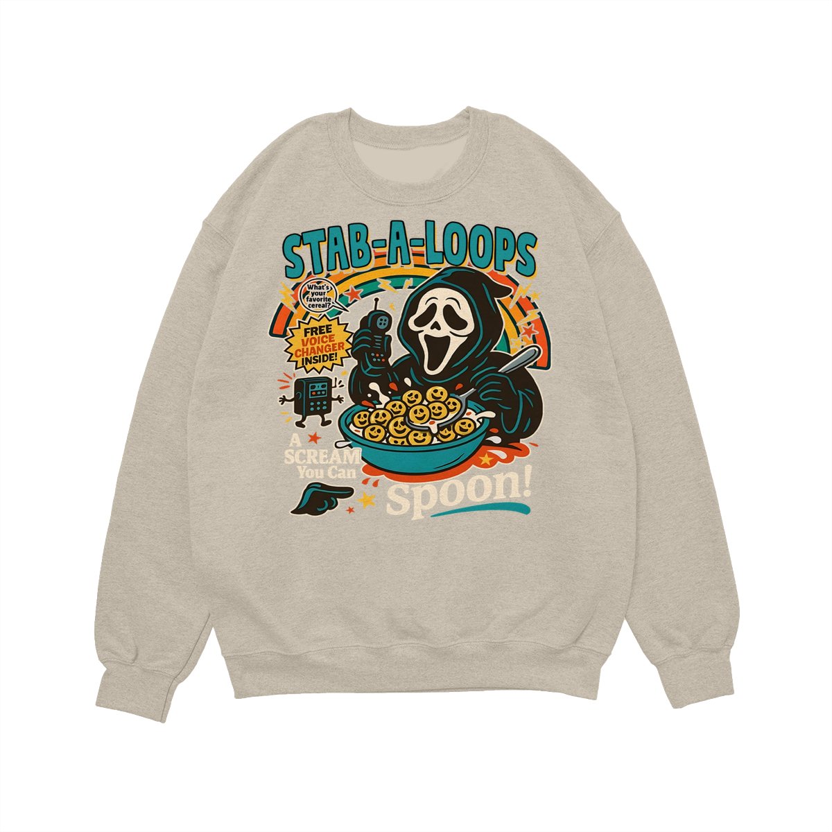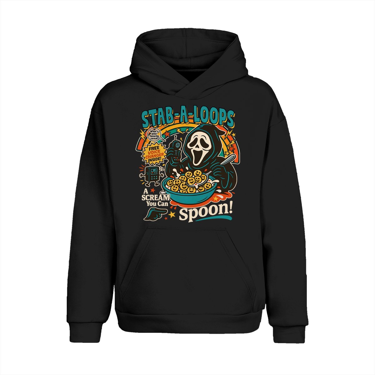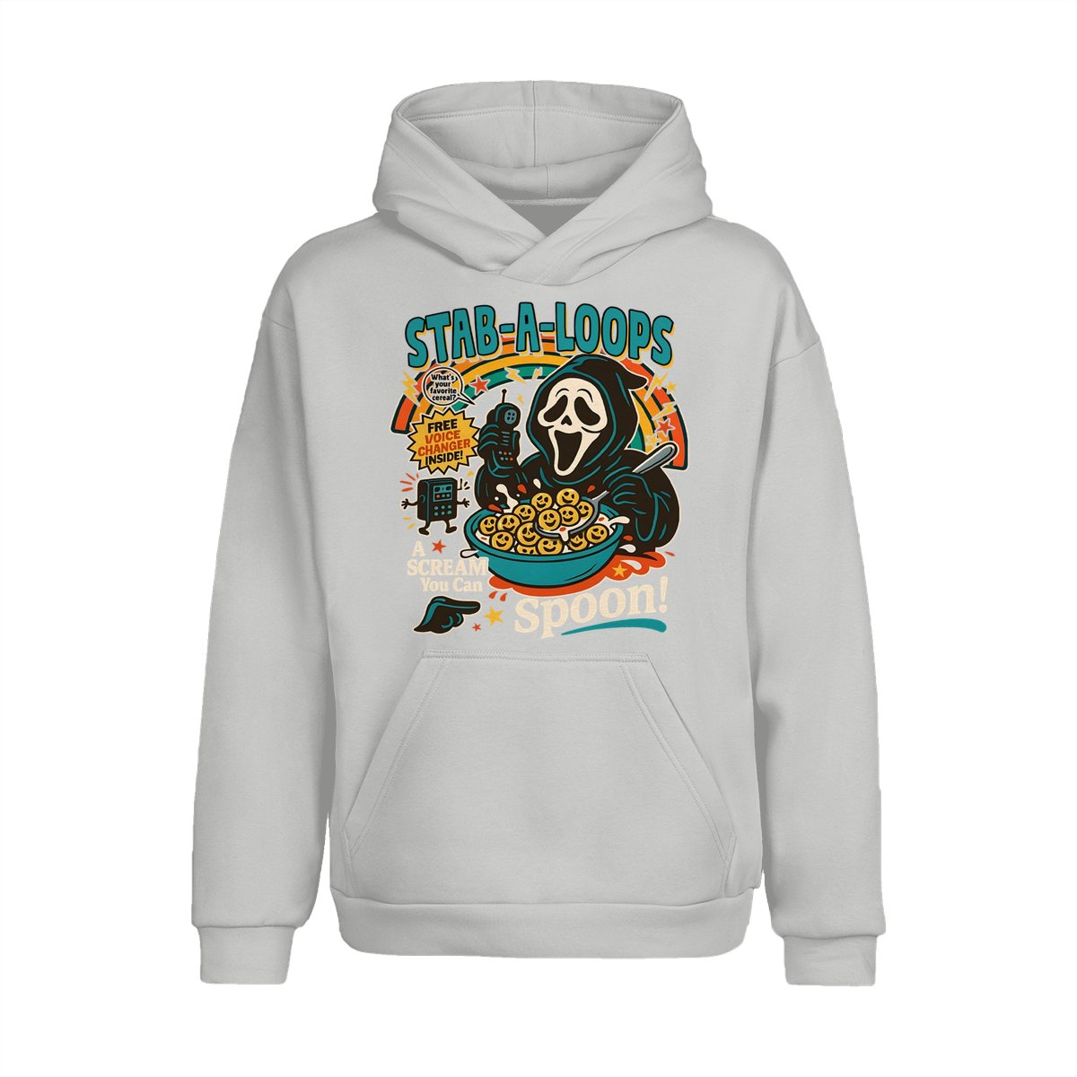 Stab-A-Loops T-Shirt – Funny Horror Cereal Graphic Tee with Scream Mask & Spoon Design | Halloween Trend Shirt for Movie & Meme Fans