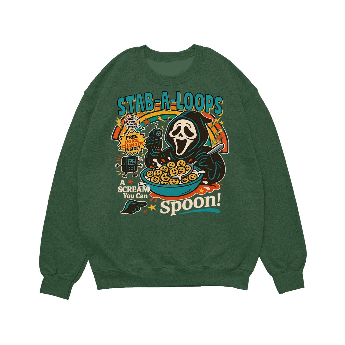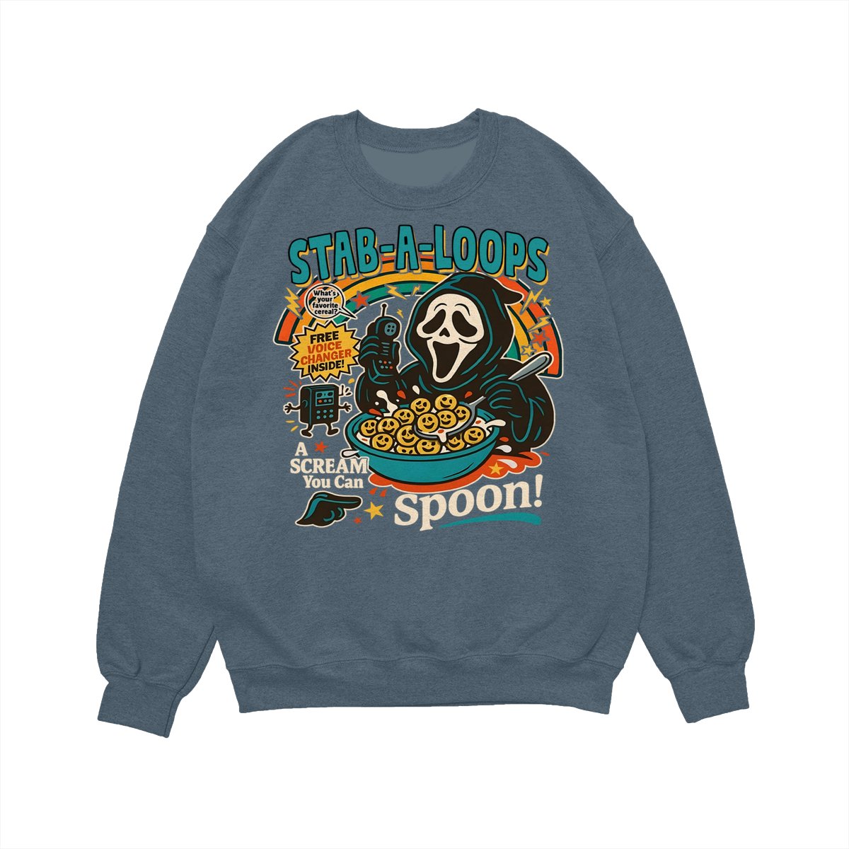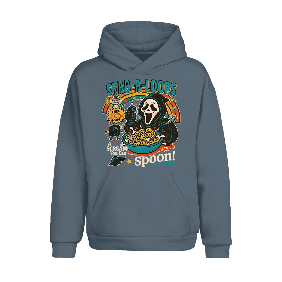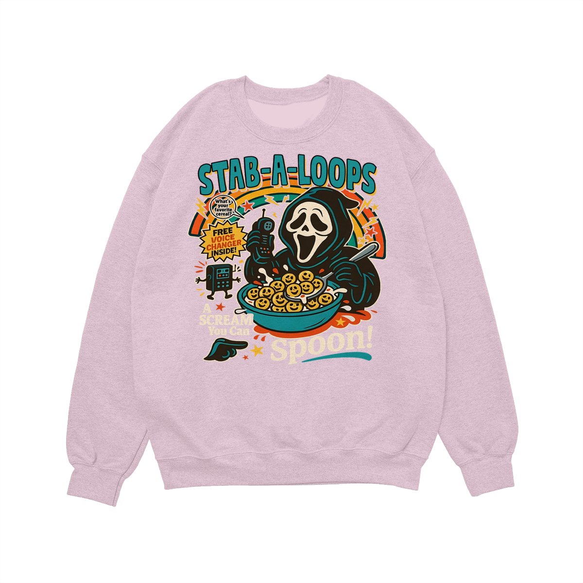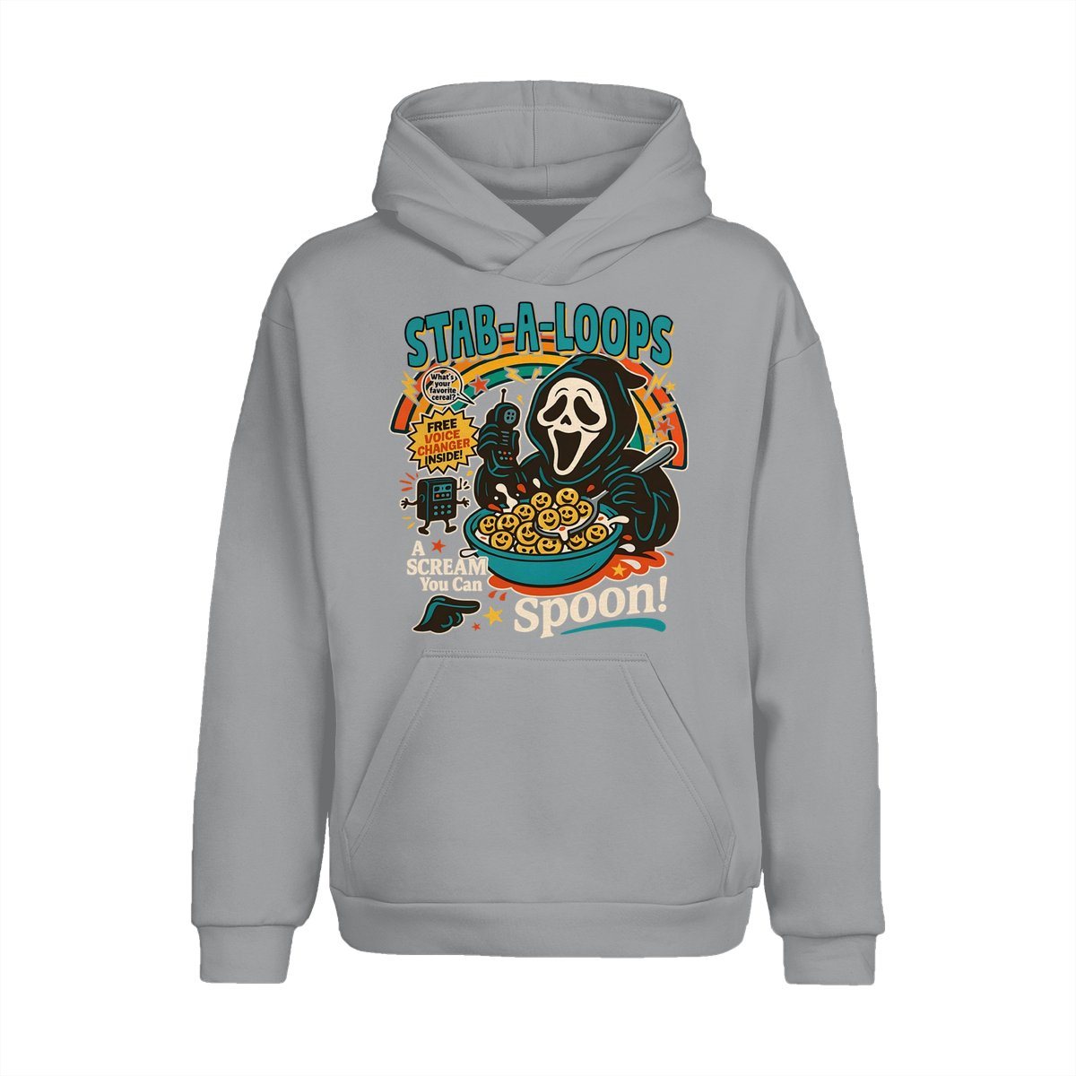 Stab-A-Loops T-Shirt – Funny Horror Cereal Graphic Tee with Scream Mask & Spoon Design | Halloween Trend Shirt for Movie & Meme Fans