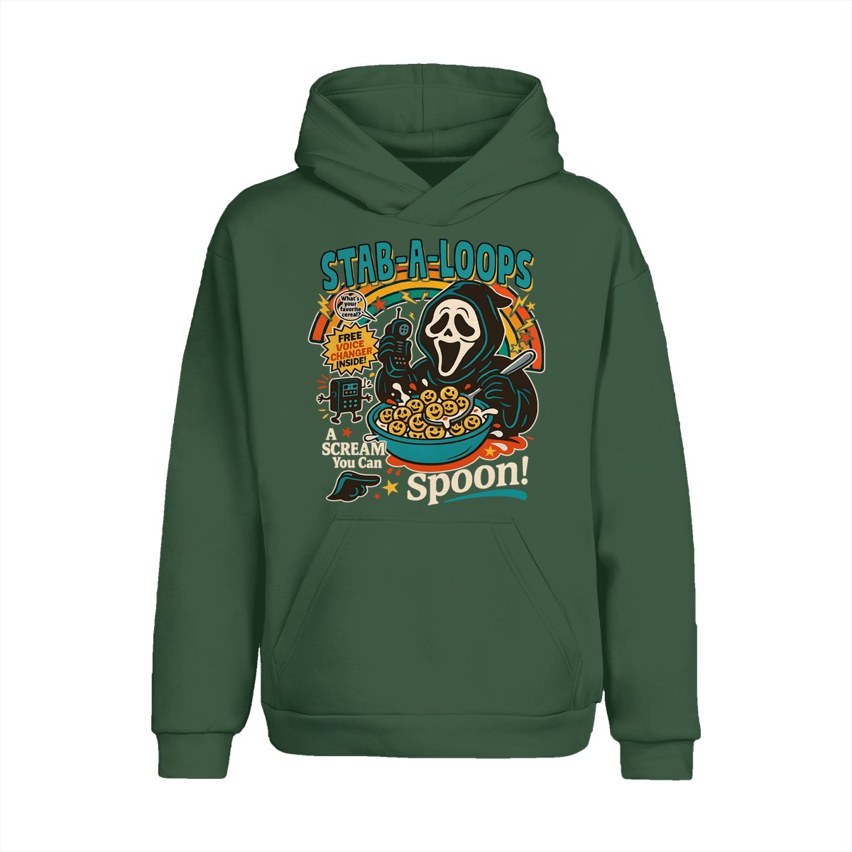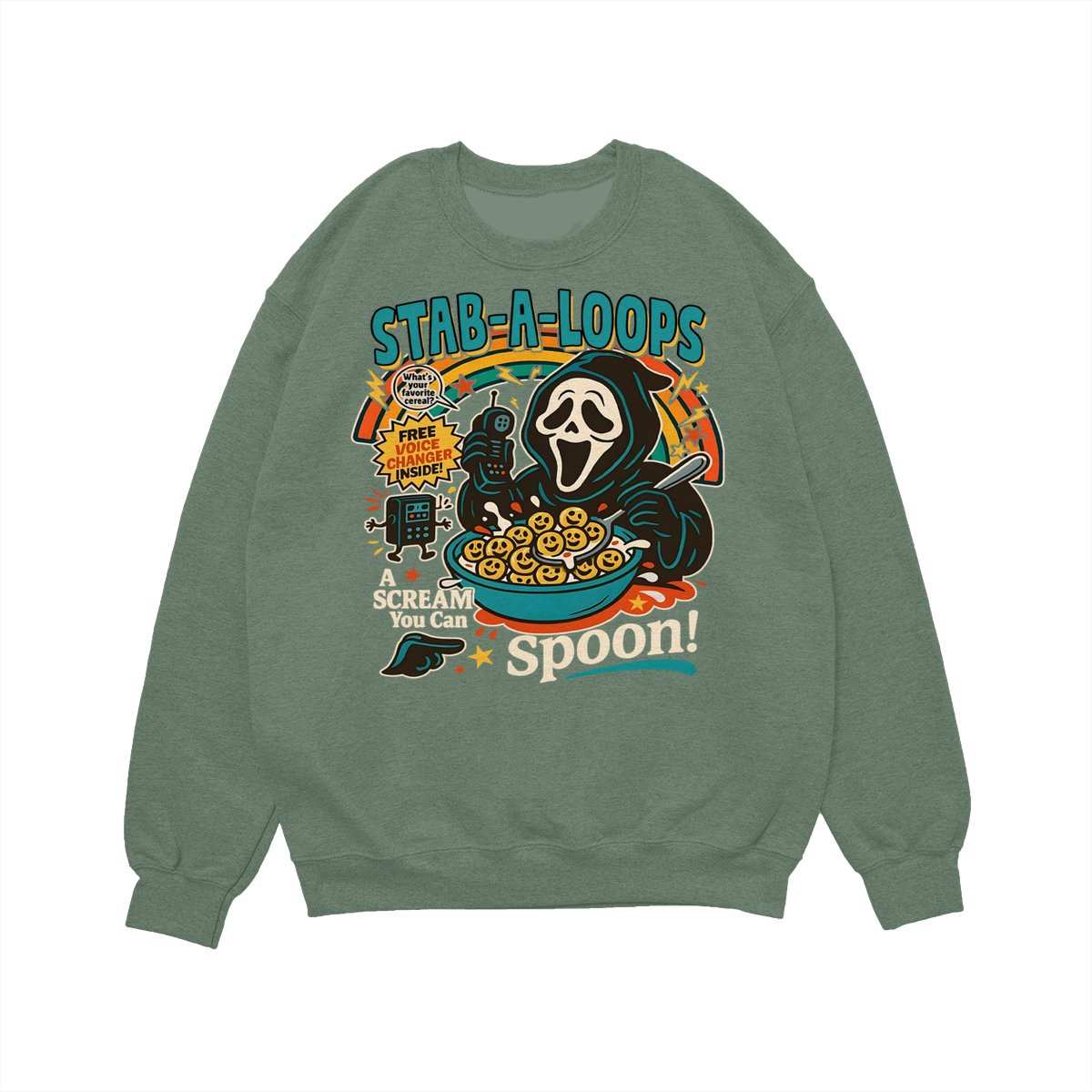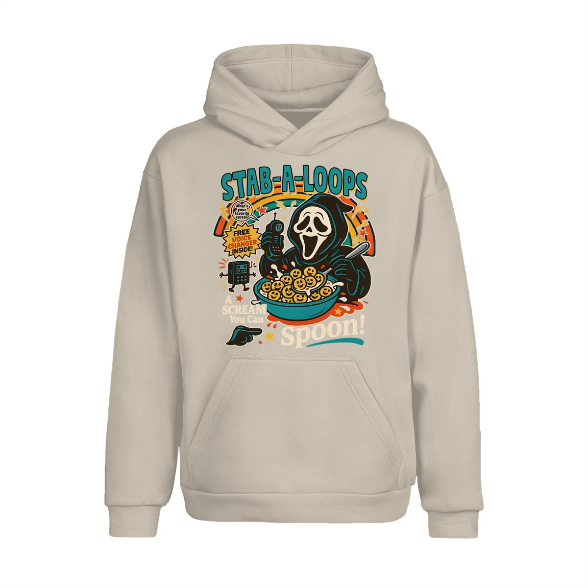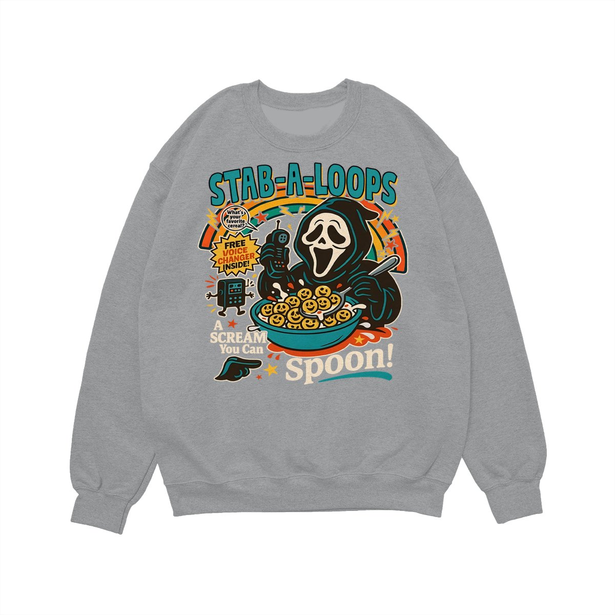 Stab-A-Loops T-Shirt – Funny Horror Cereal Graphic Tee with Scream Mask & Spoon Design | Halloween Trend Shirt for Movie & Meme Fans