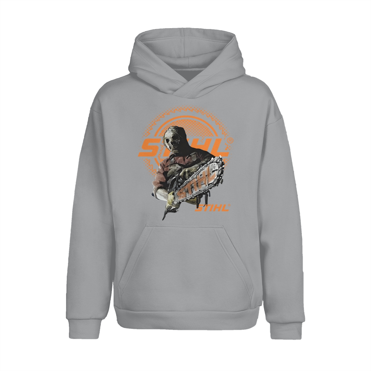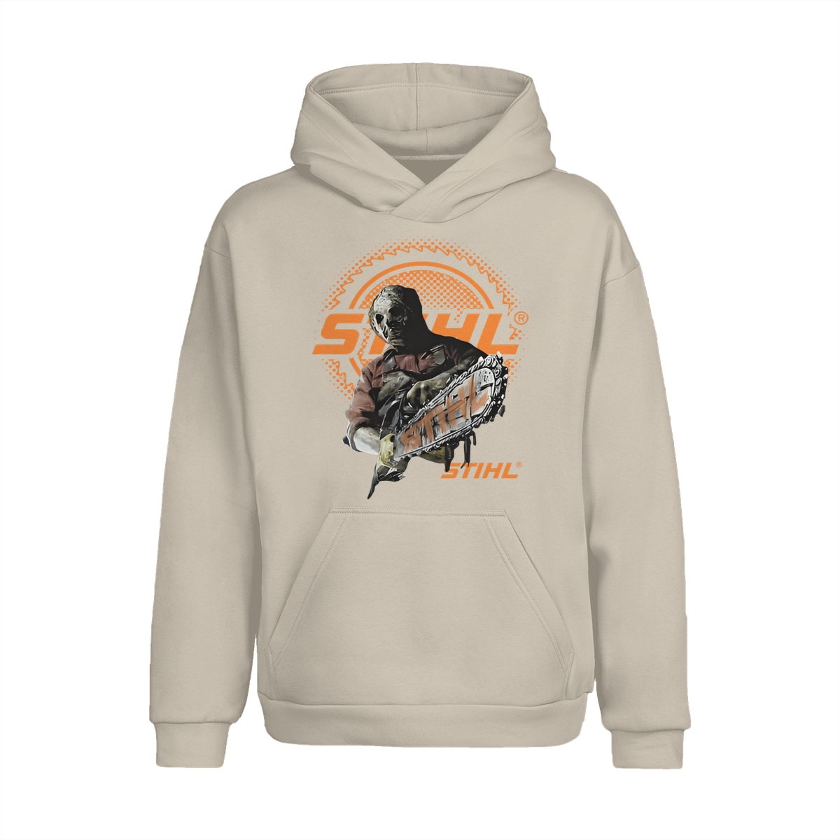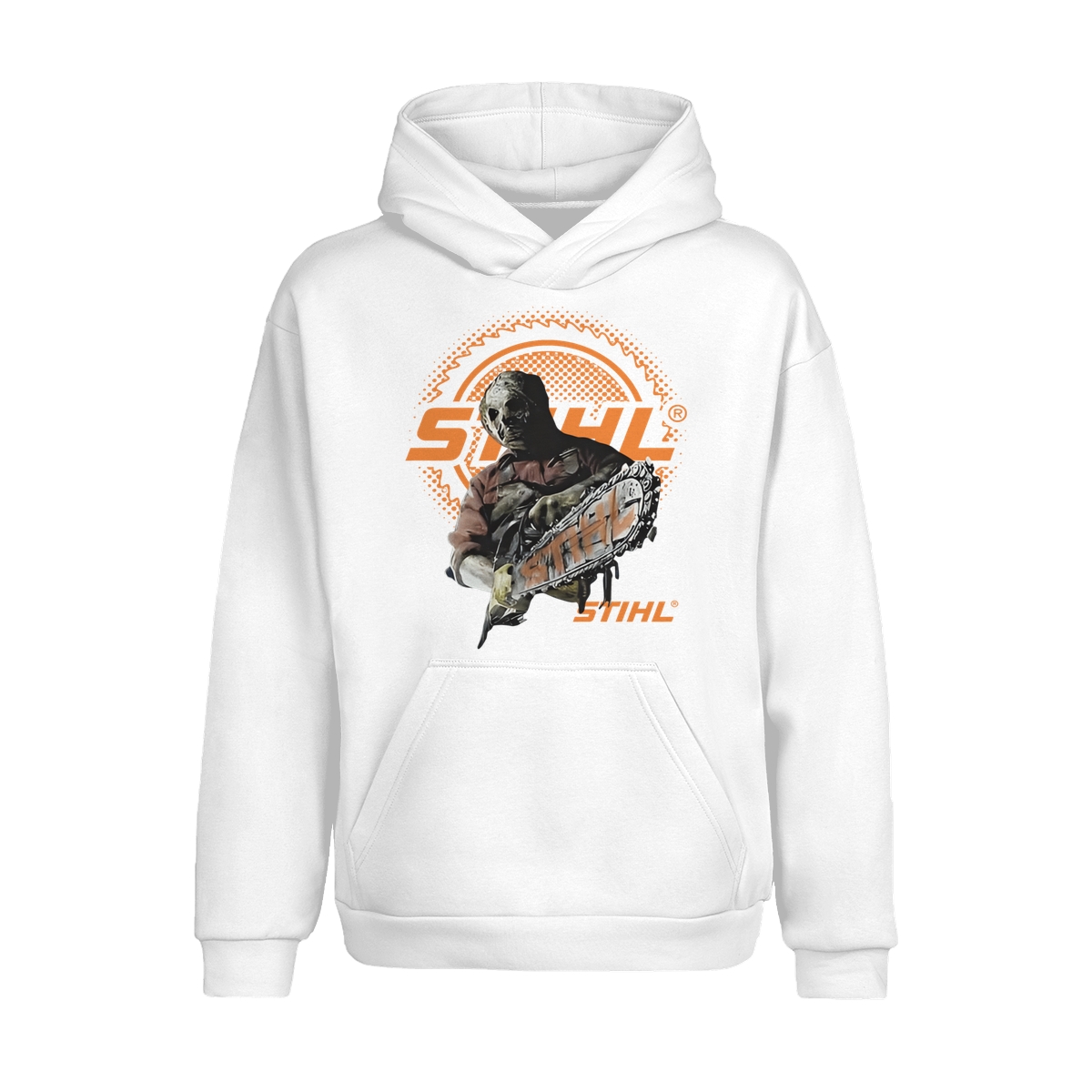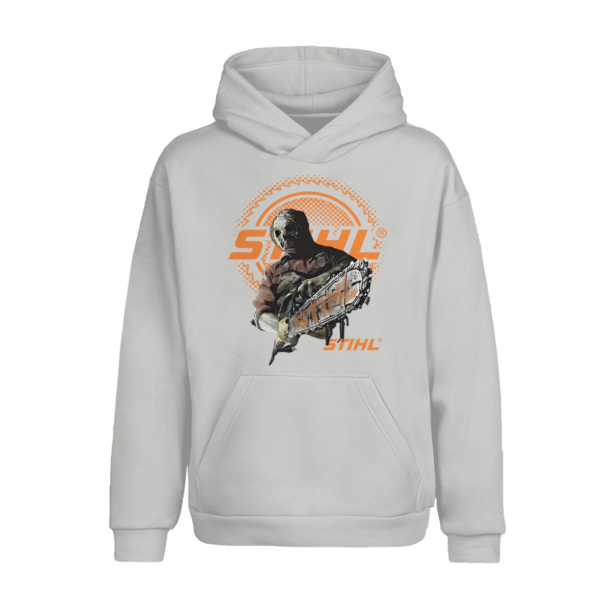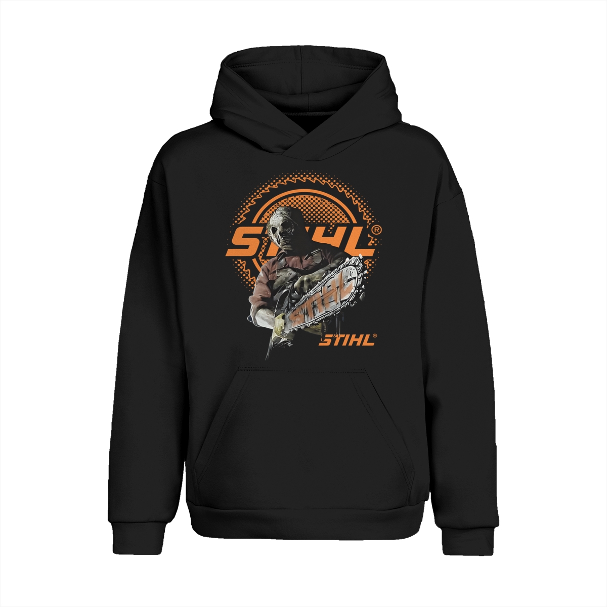 STIHL Leatherface T-Shirt – Sweatshirt – Hoodie, Streetwear – Horror Chainsaw Parody Tee, Bold Orange Saw Blade Logo, Funny Graphic for Tool Fans & Scary Movie Lovers