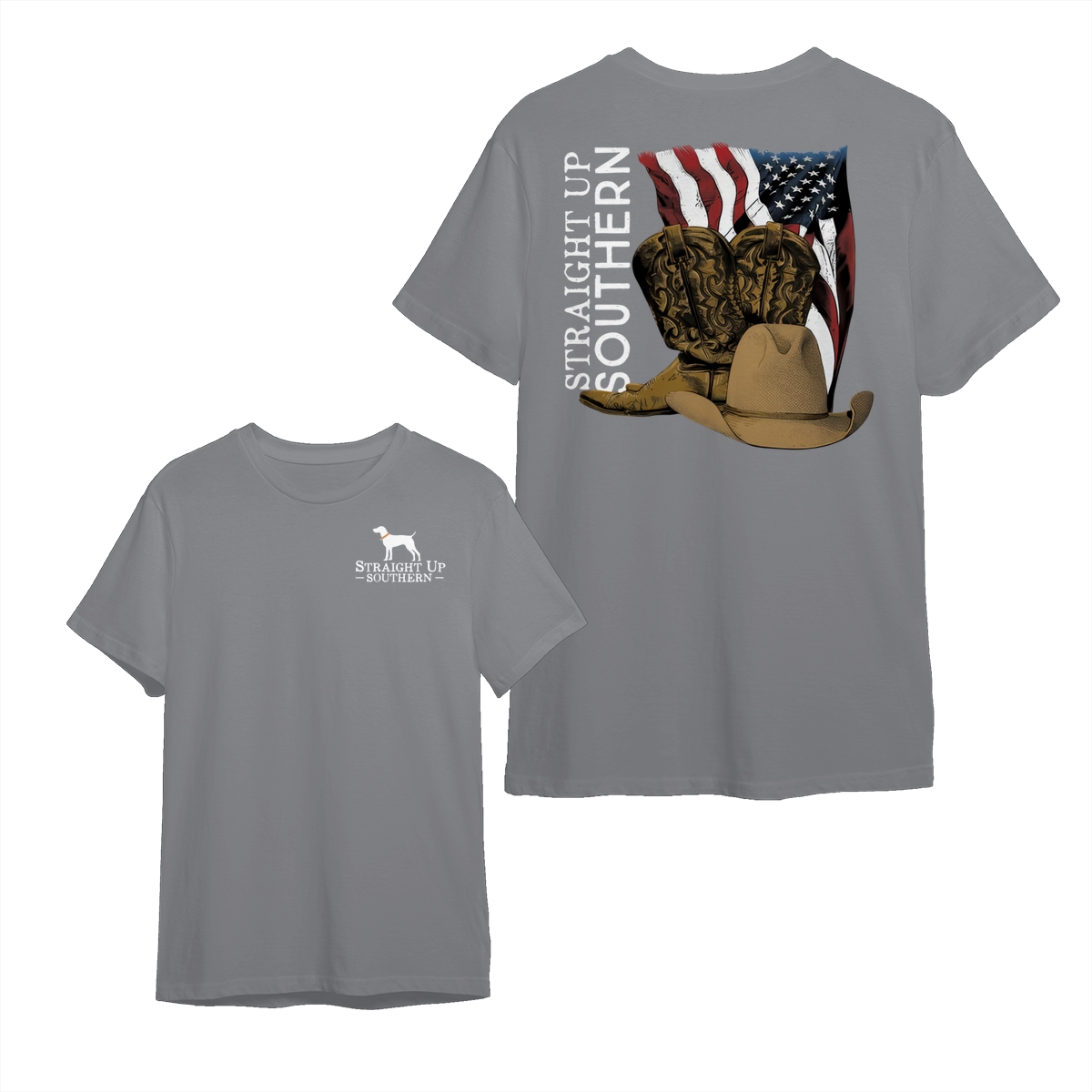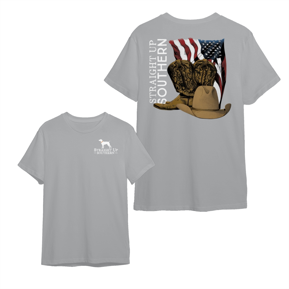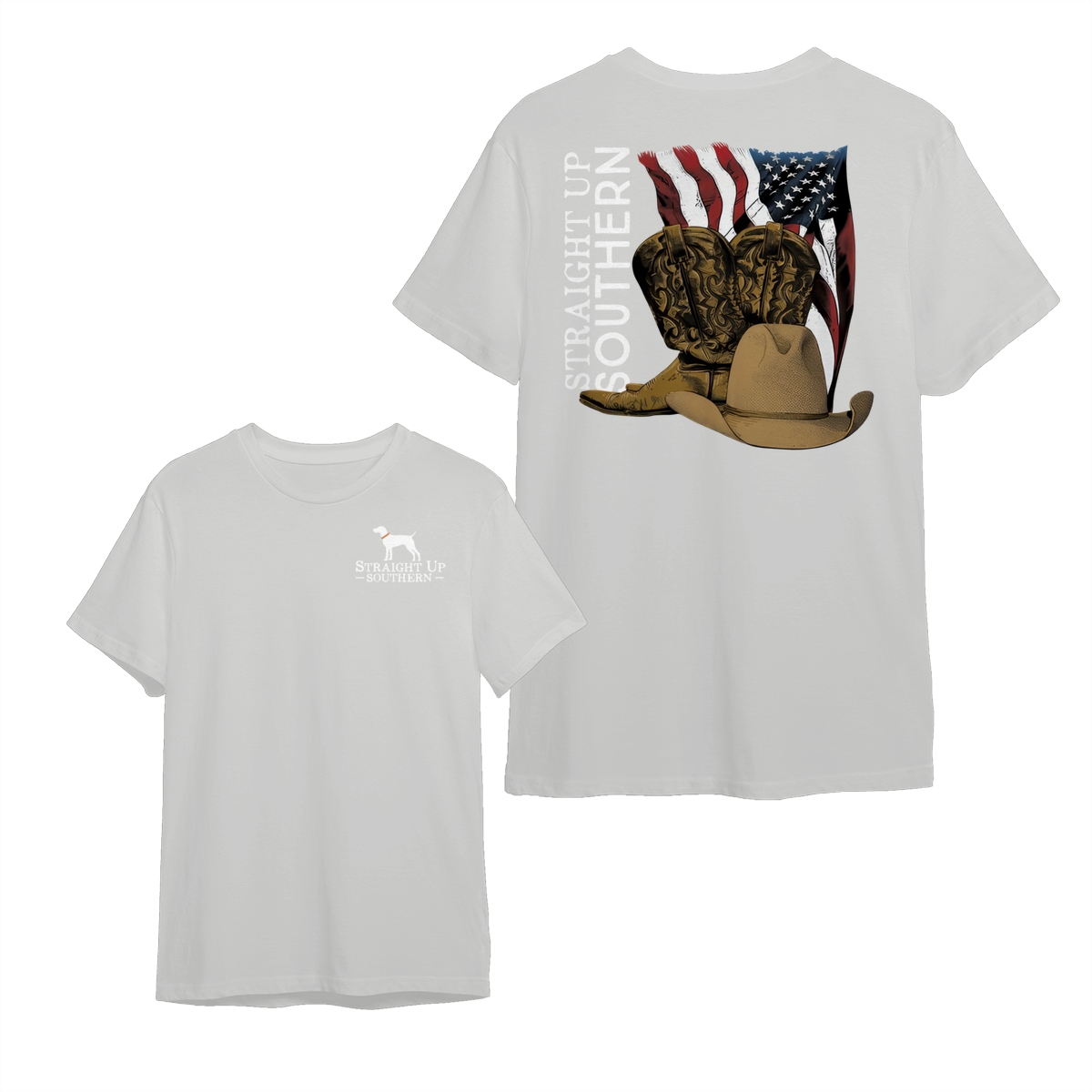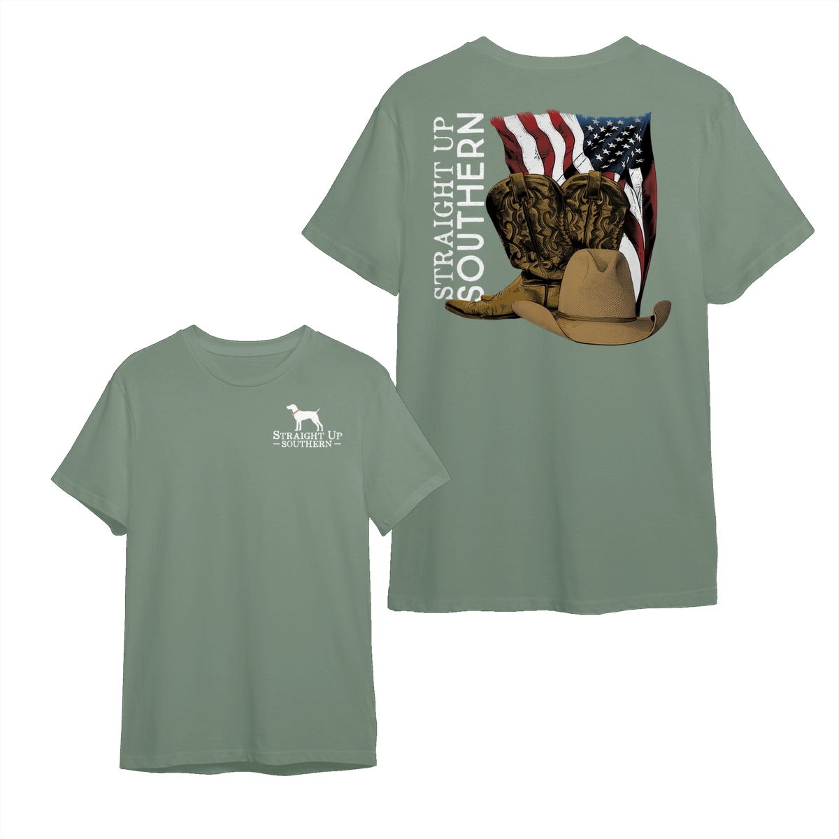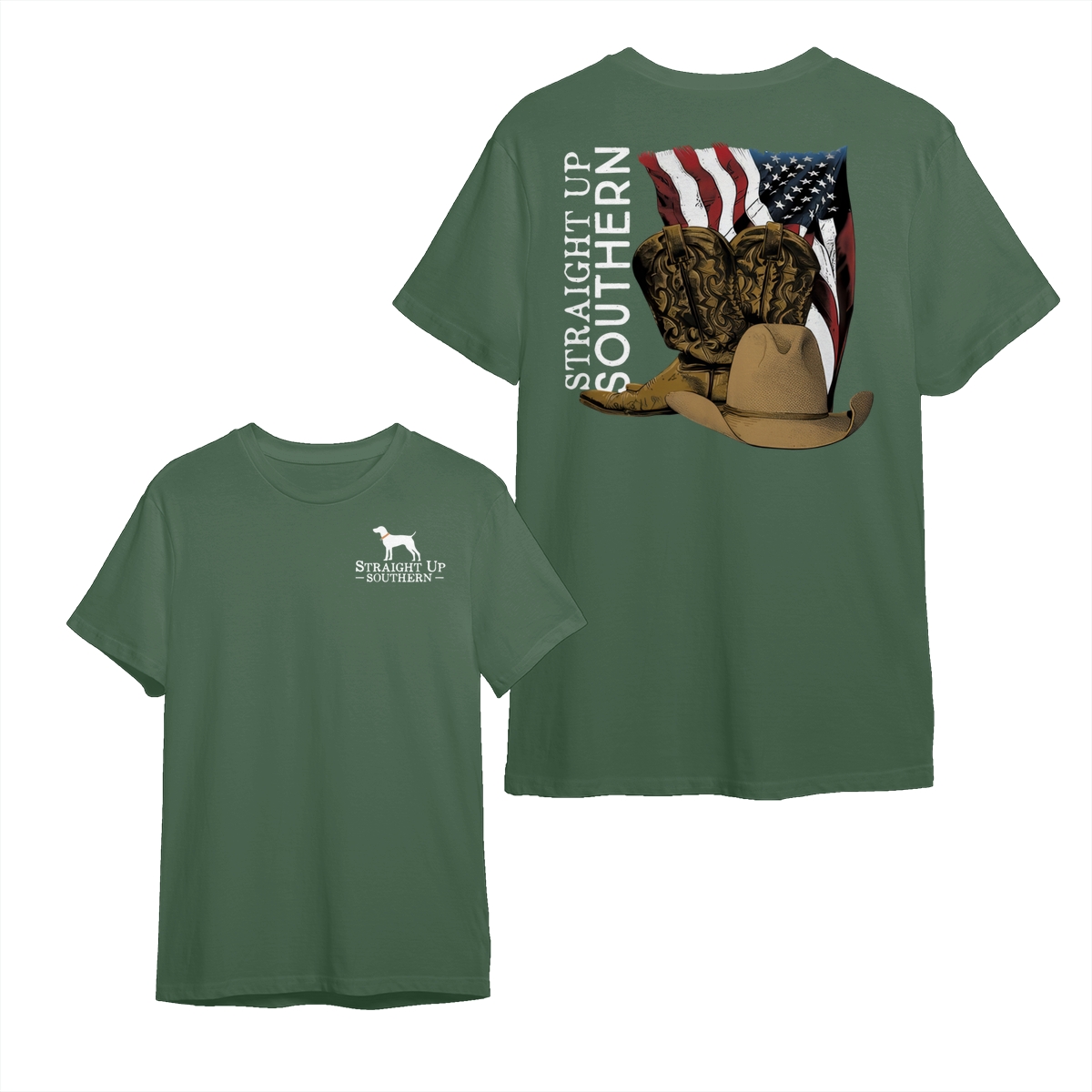 Straight Up Southern Men’s Graphic T-Shirt – Cowboy Boots and Western Hat with American Flag – Patriotic Country Style Tee for Western Fashion Fans, Southern Pride Supporters, and Rural Lifestyle Enthusiasts