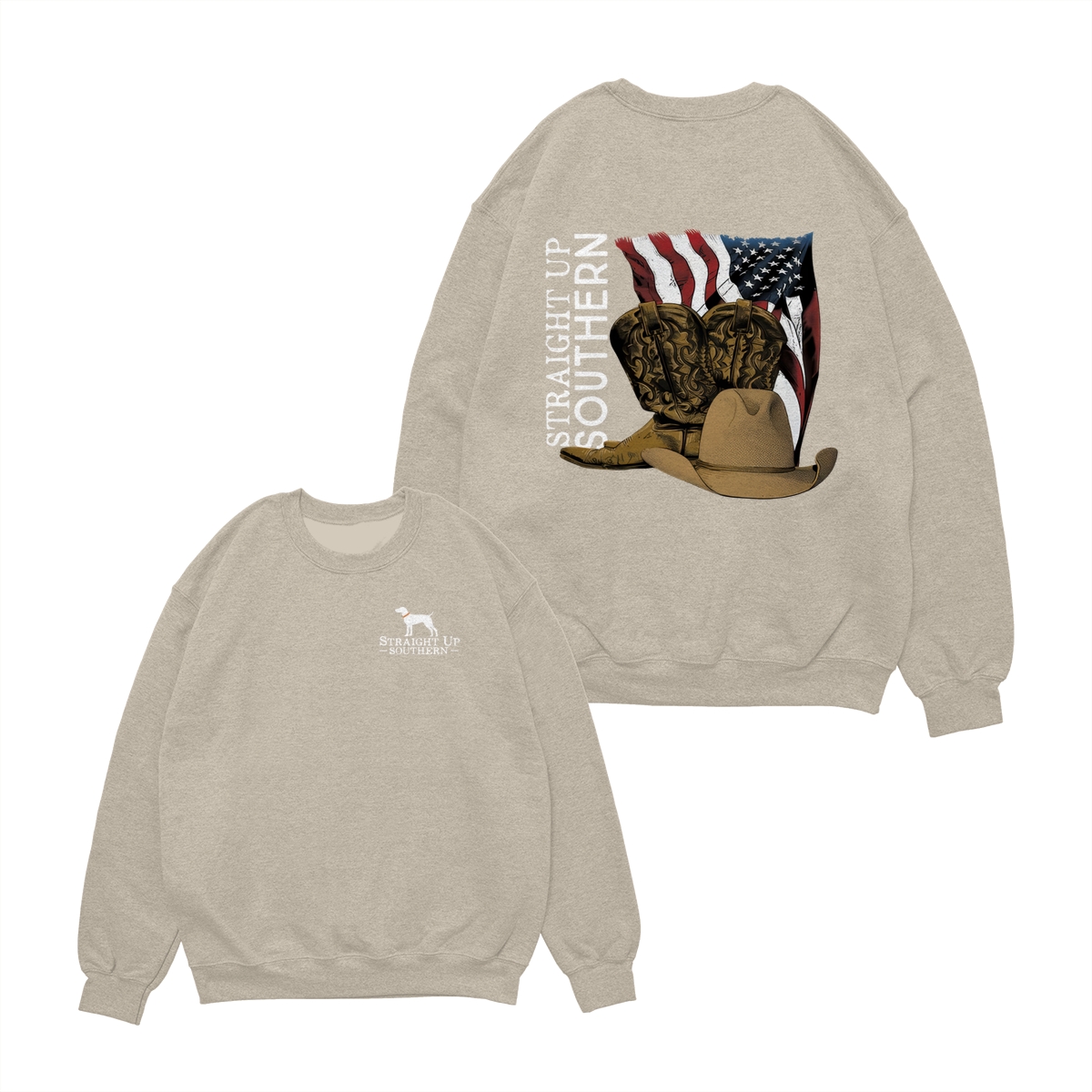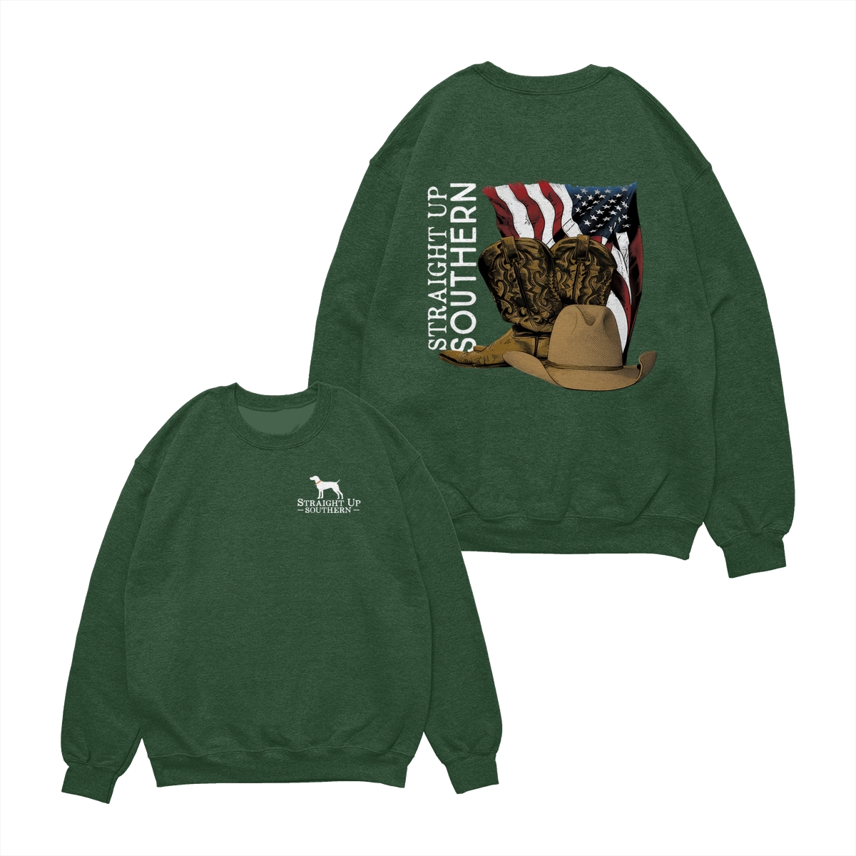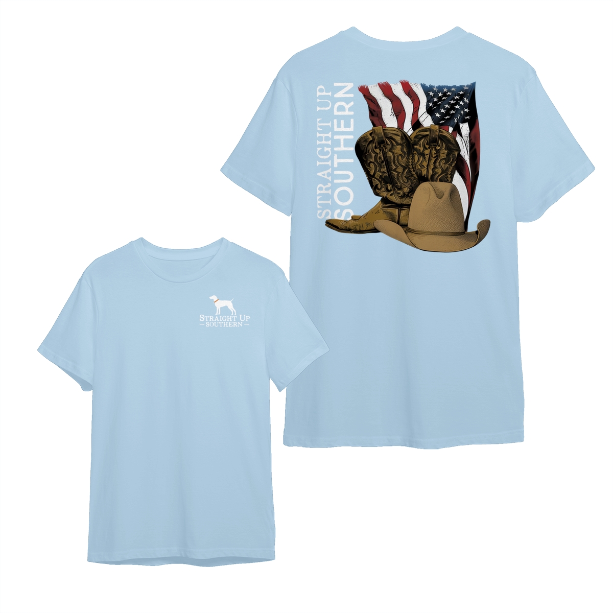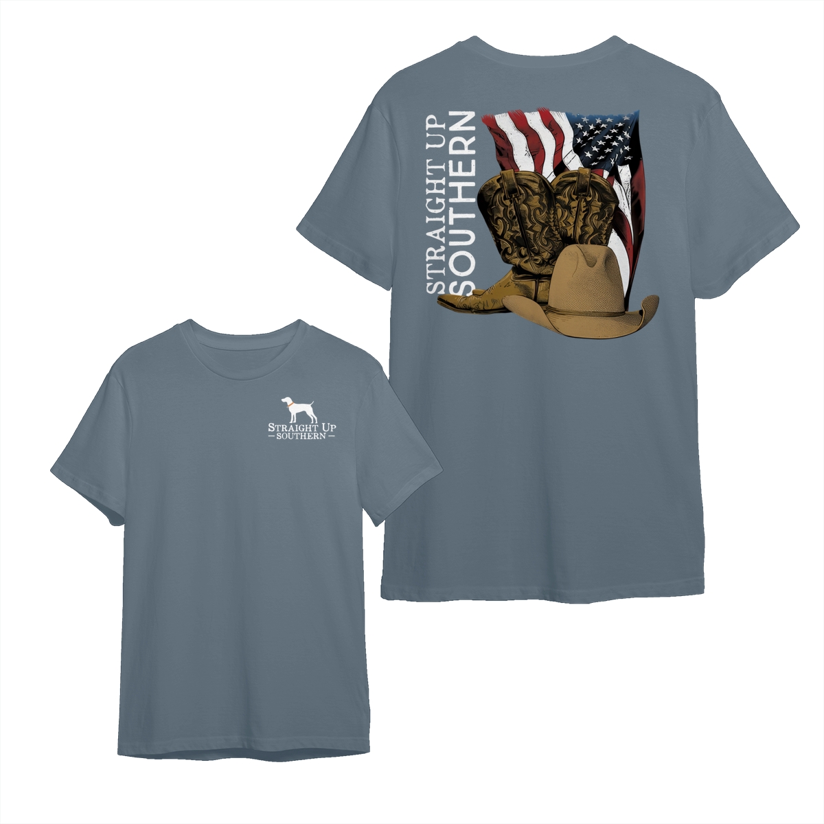 Straight Up Southern Men’s Graphic T-Shirt – Cowboy Boots and Western Hat with American Flag – Patriotic Country Style Tee for Western Fashion Fans, Southern Pride Supporters, and Rural Lifestyle Enthusiasts