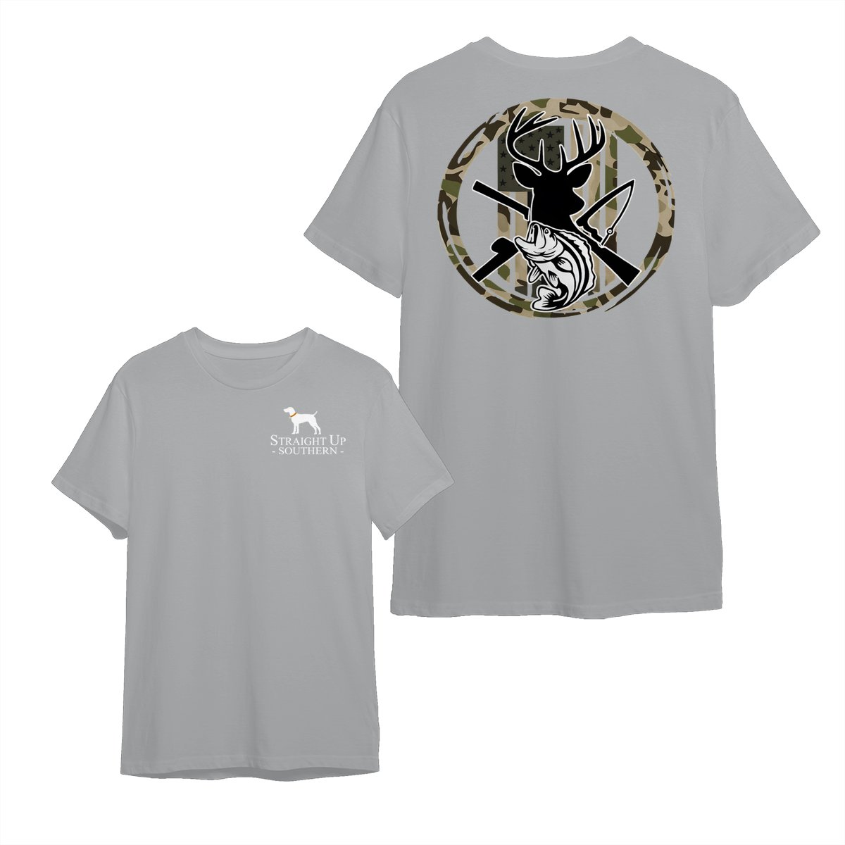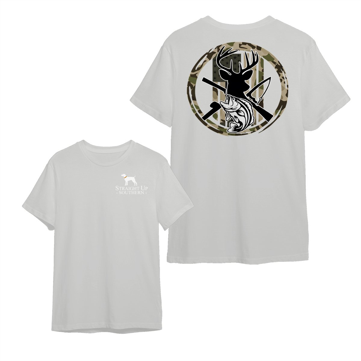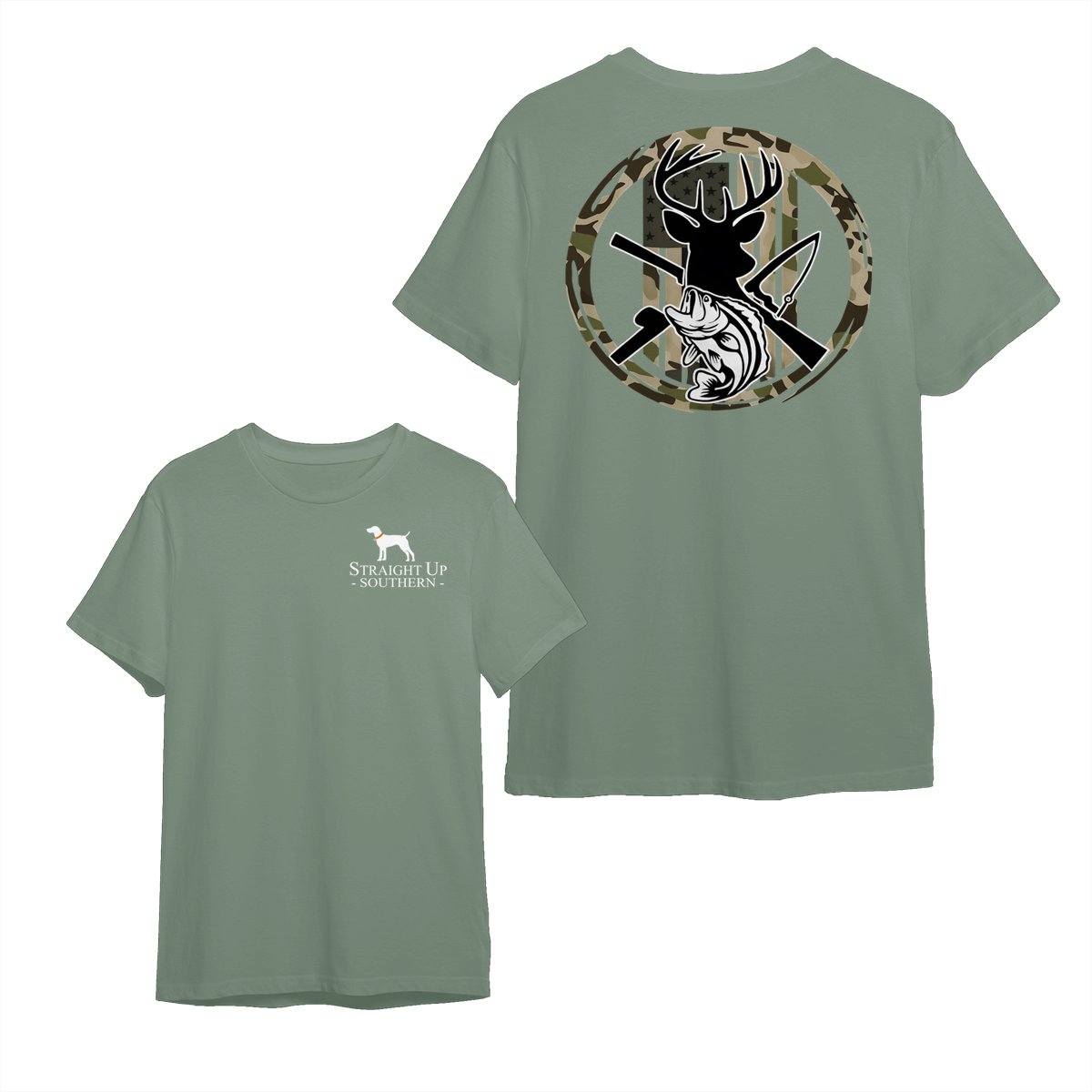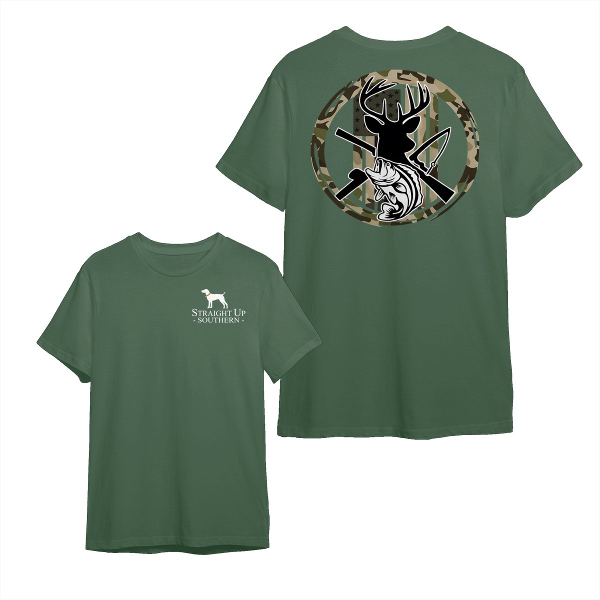 Straight Up Southern T-Shirt – Hunting & Fishing Graphic with Buck, Bass, and Camo – Outdoor Lifestyle Tee for Country Men