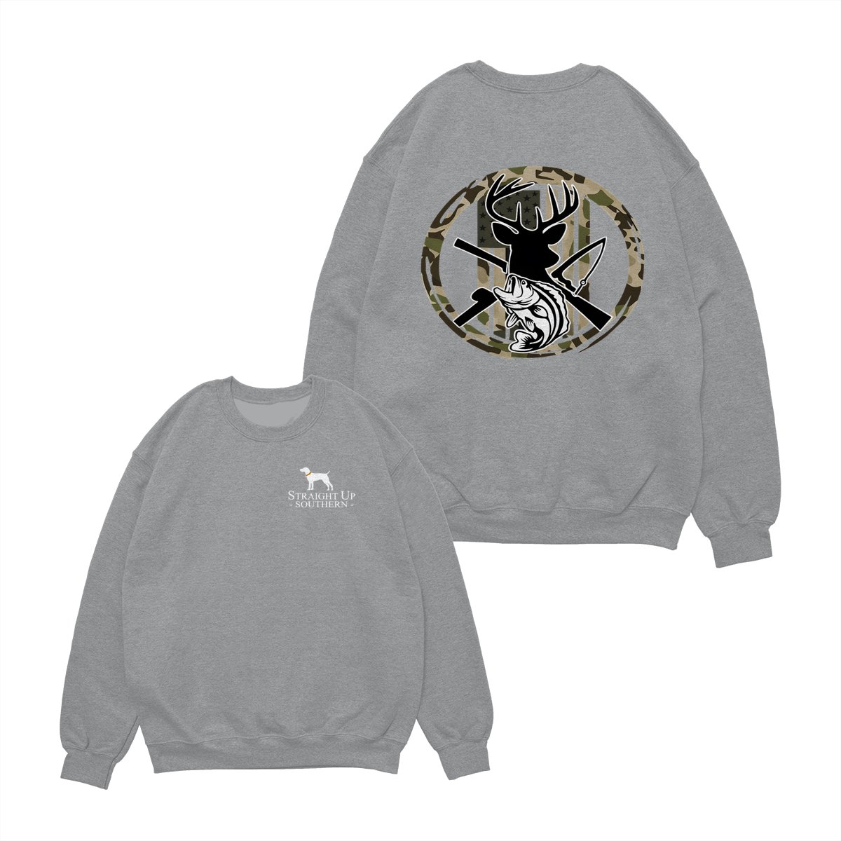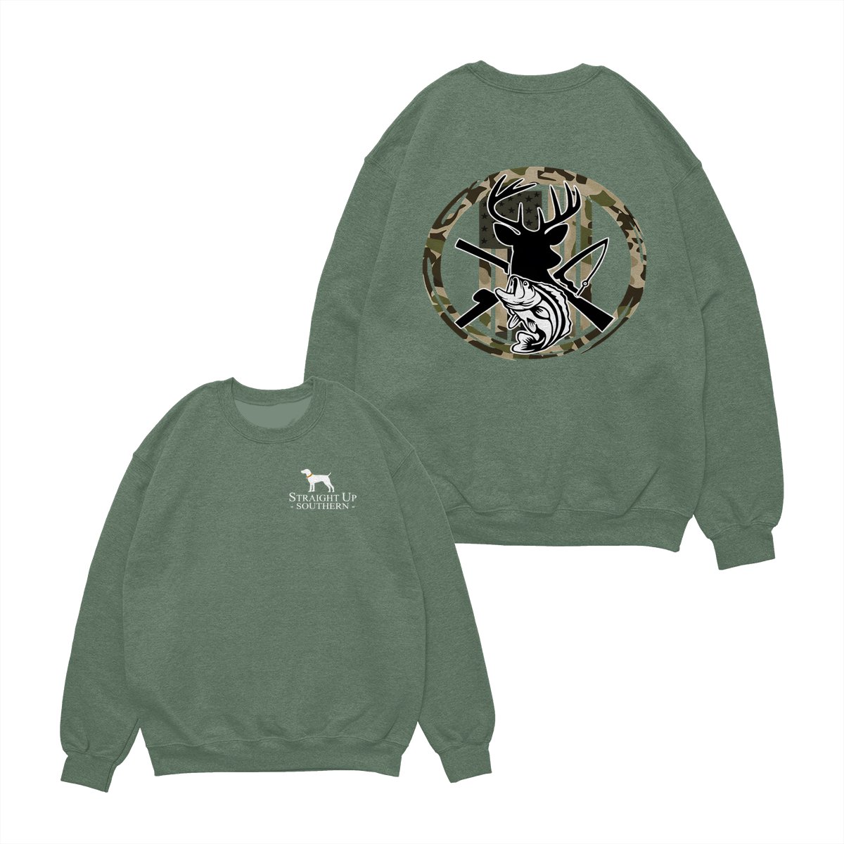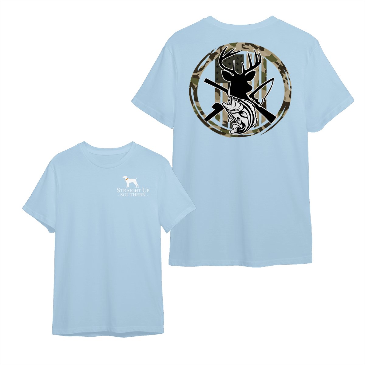 Straight Up Southern T-Shirt – Hunting & Fishing Graphic with Buck, Bass, and Camo – Outdoor Lifestyle Tee for Country Men