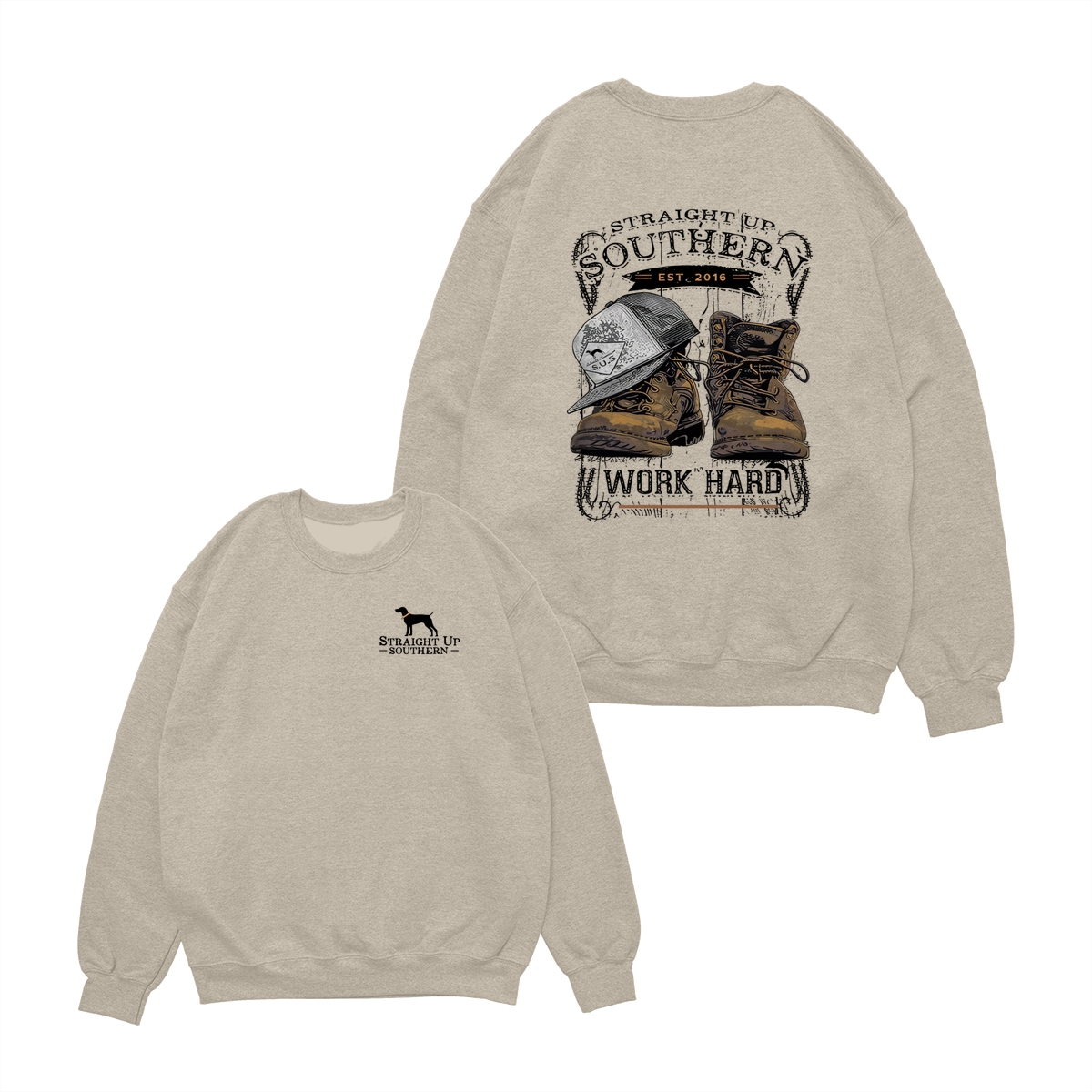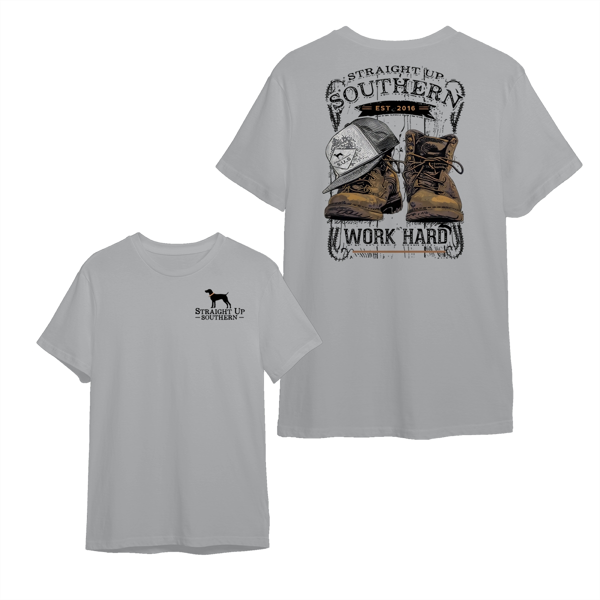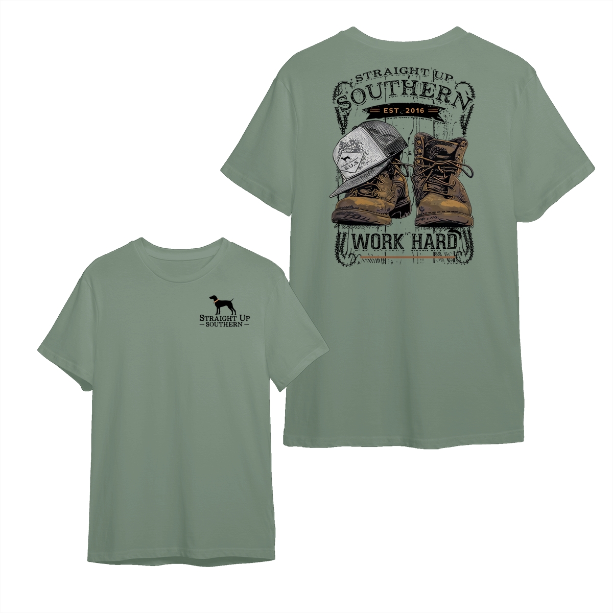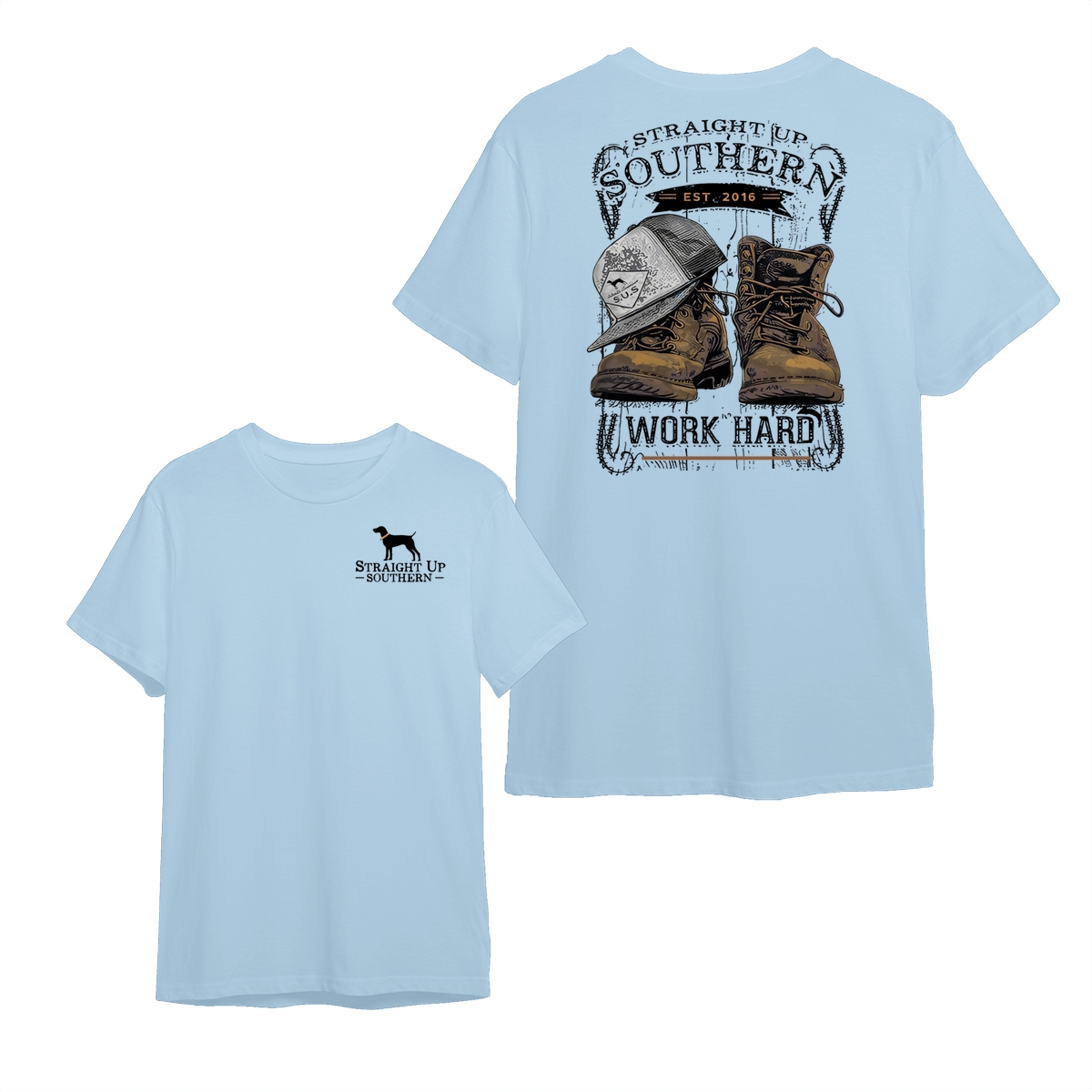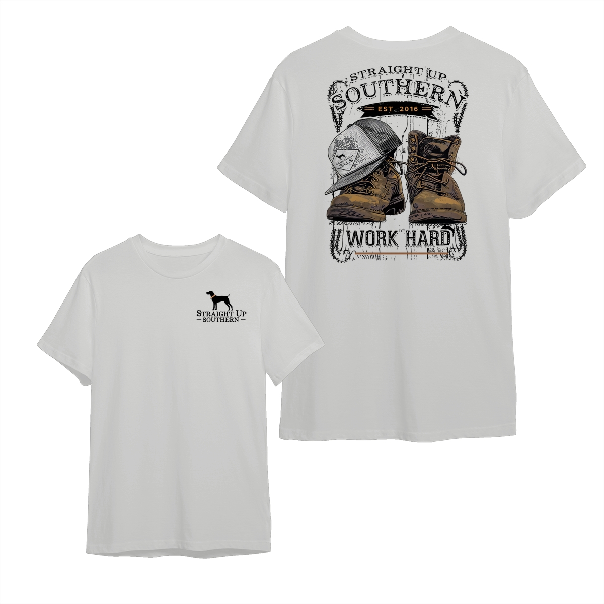 Straight Up Southern Work Hard Boots & Hat T-Shirt – Vintage Work Boots and Cap Design – High-Quality Print on Black Cotton Tee – Motivational Outdoor & Country Graphic Tee for Men, Est. 2016