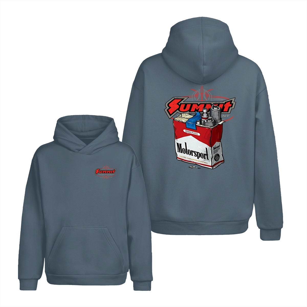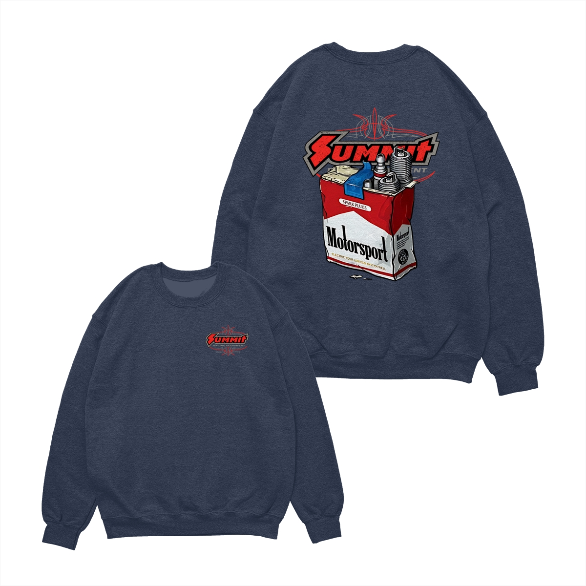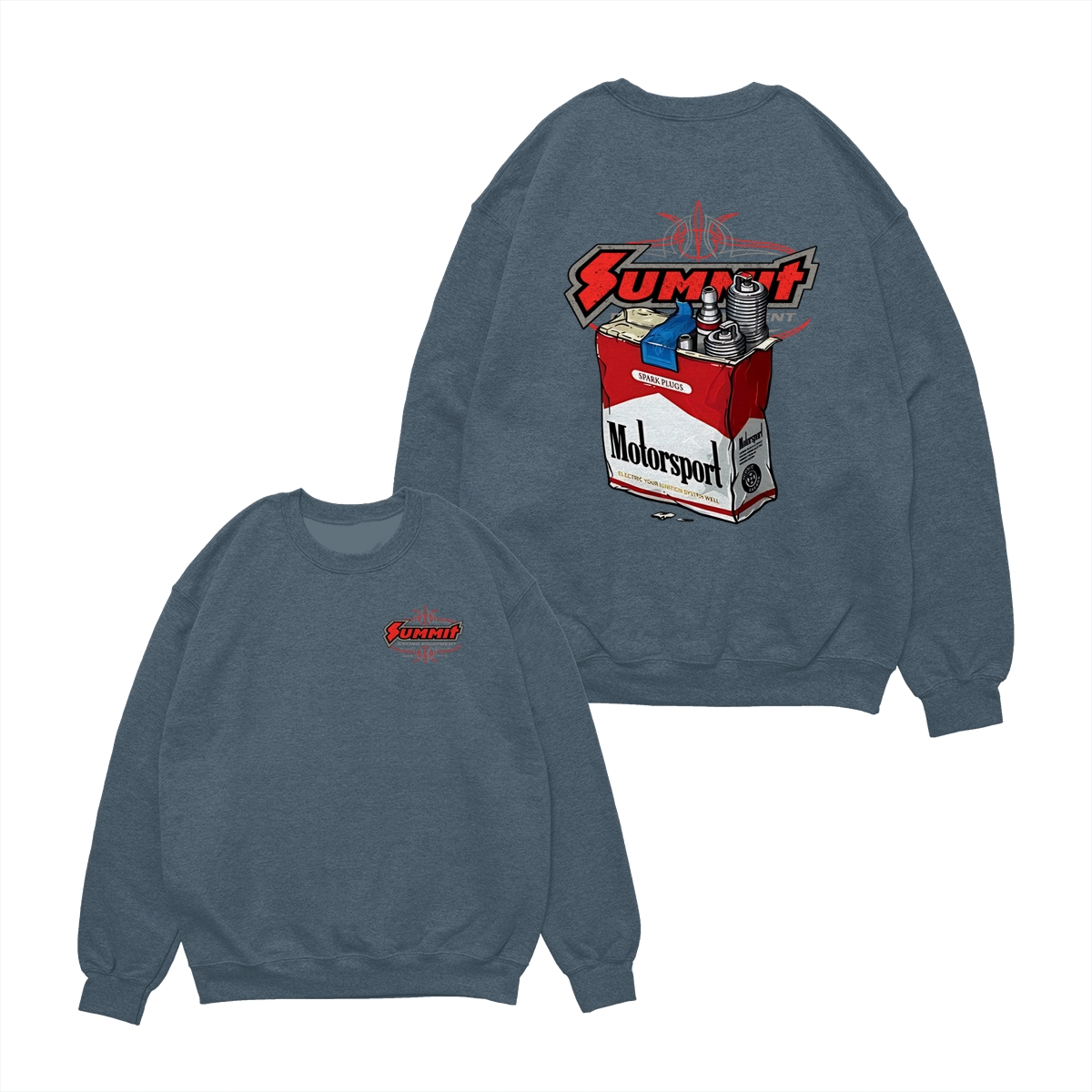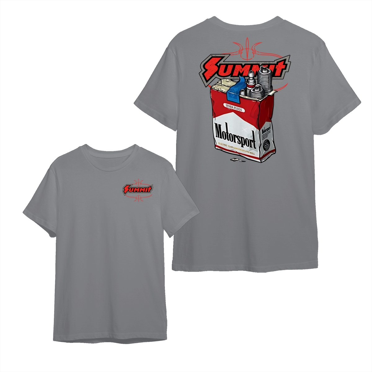 Summit Motorsport Racing T-Shirt, Spark Plug Cigarette Pack Parody Graphic Tee, Bold Garage Style Shirt for Car Builders & Mechanics, Gift for Motorsport Fans & Gearheads