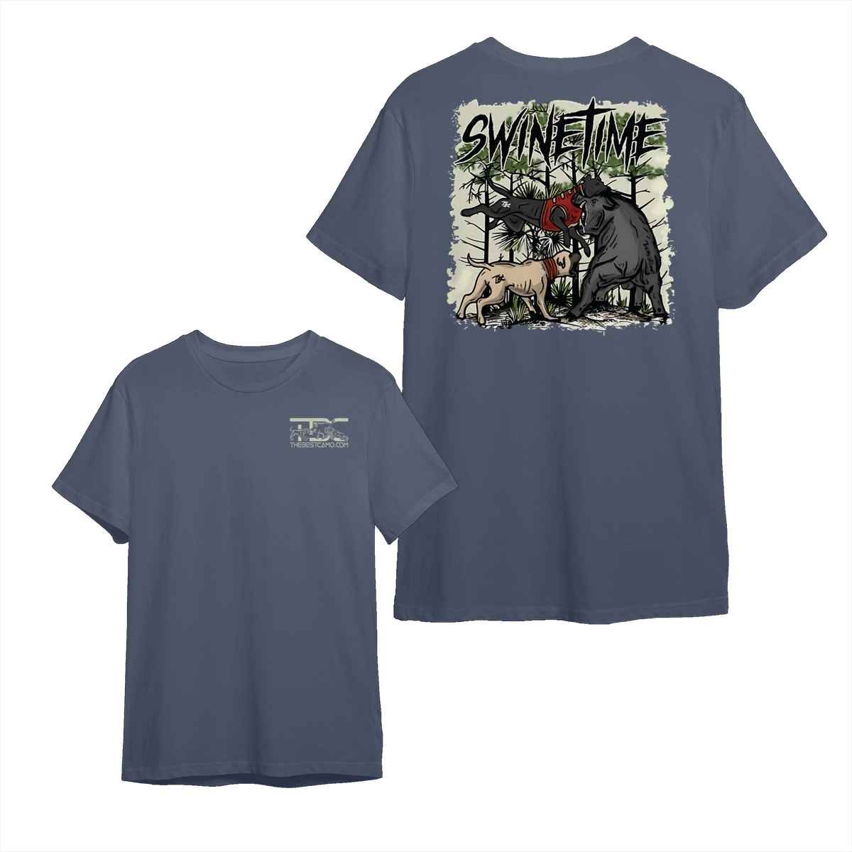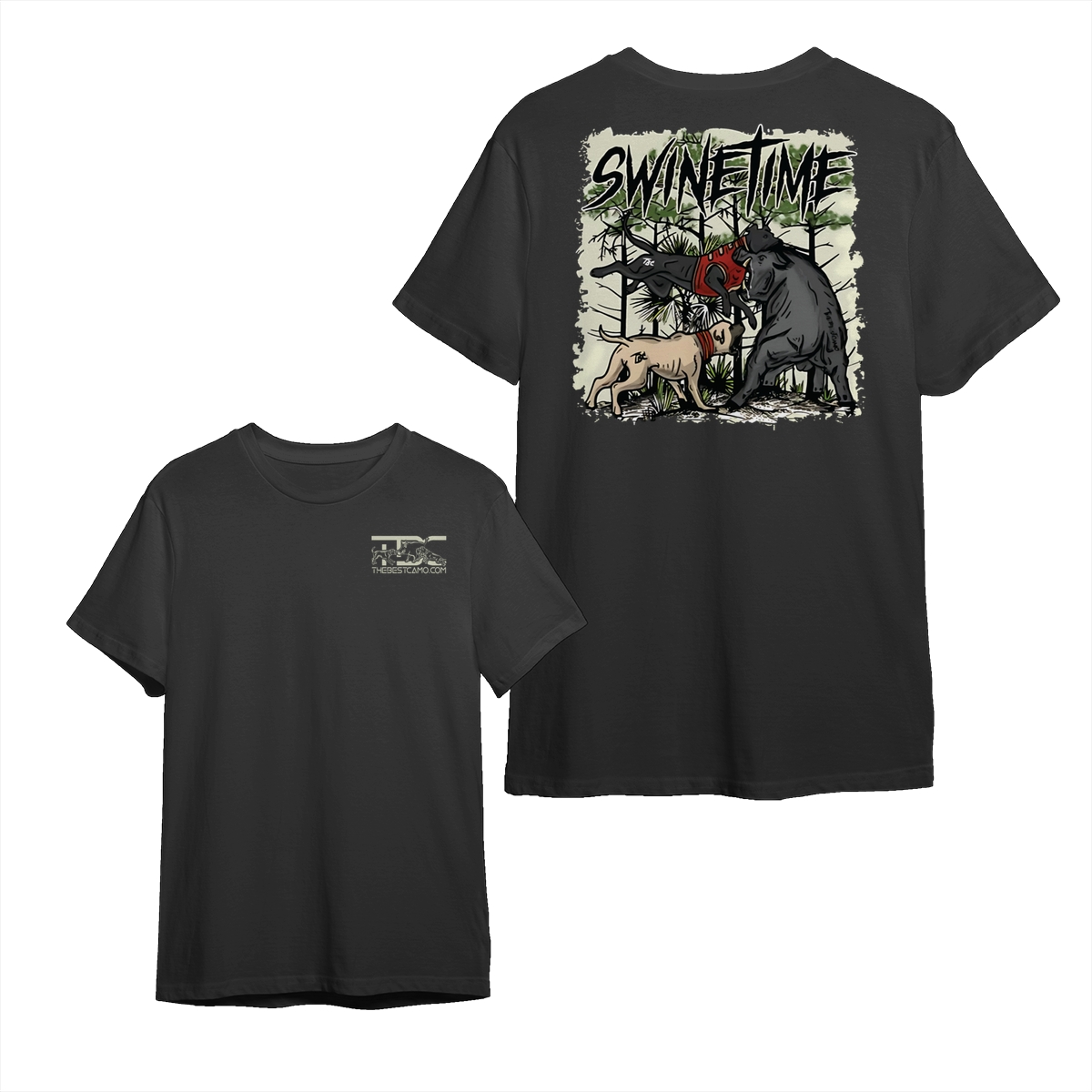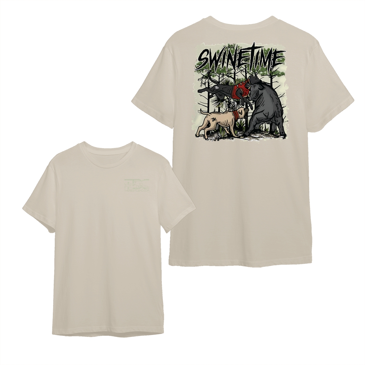 Swine Time Hog Hunting Graphic Tshirt, Cartoon Style with Hunting Dogs and Boar Design, Outdoor Men’s Shirt for Hog Hunters, Menswear Top