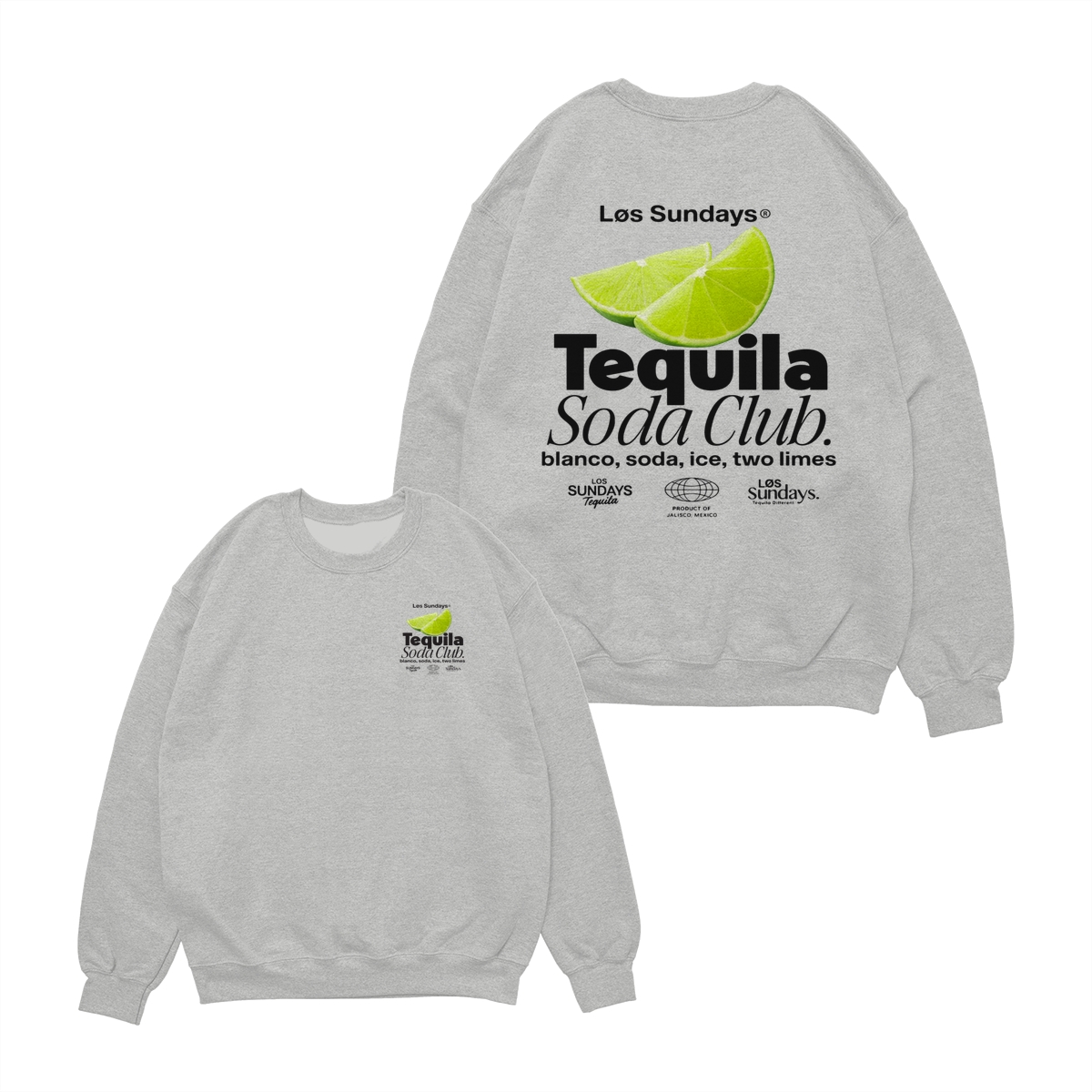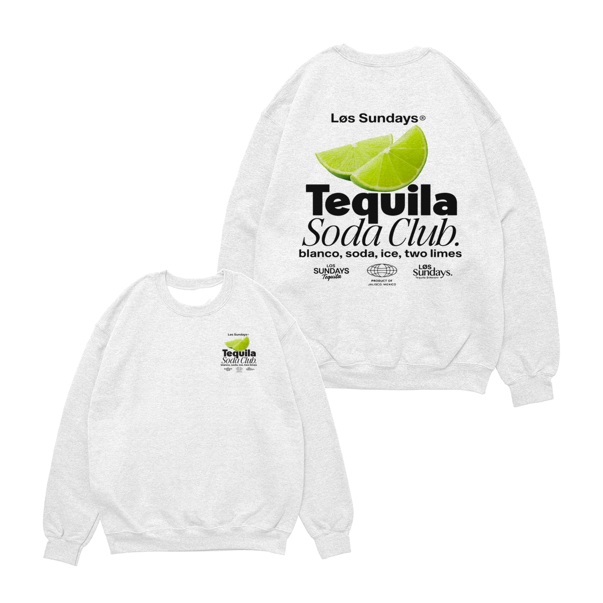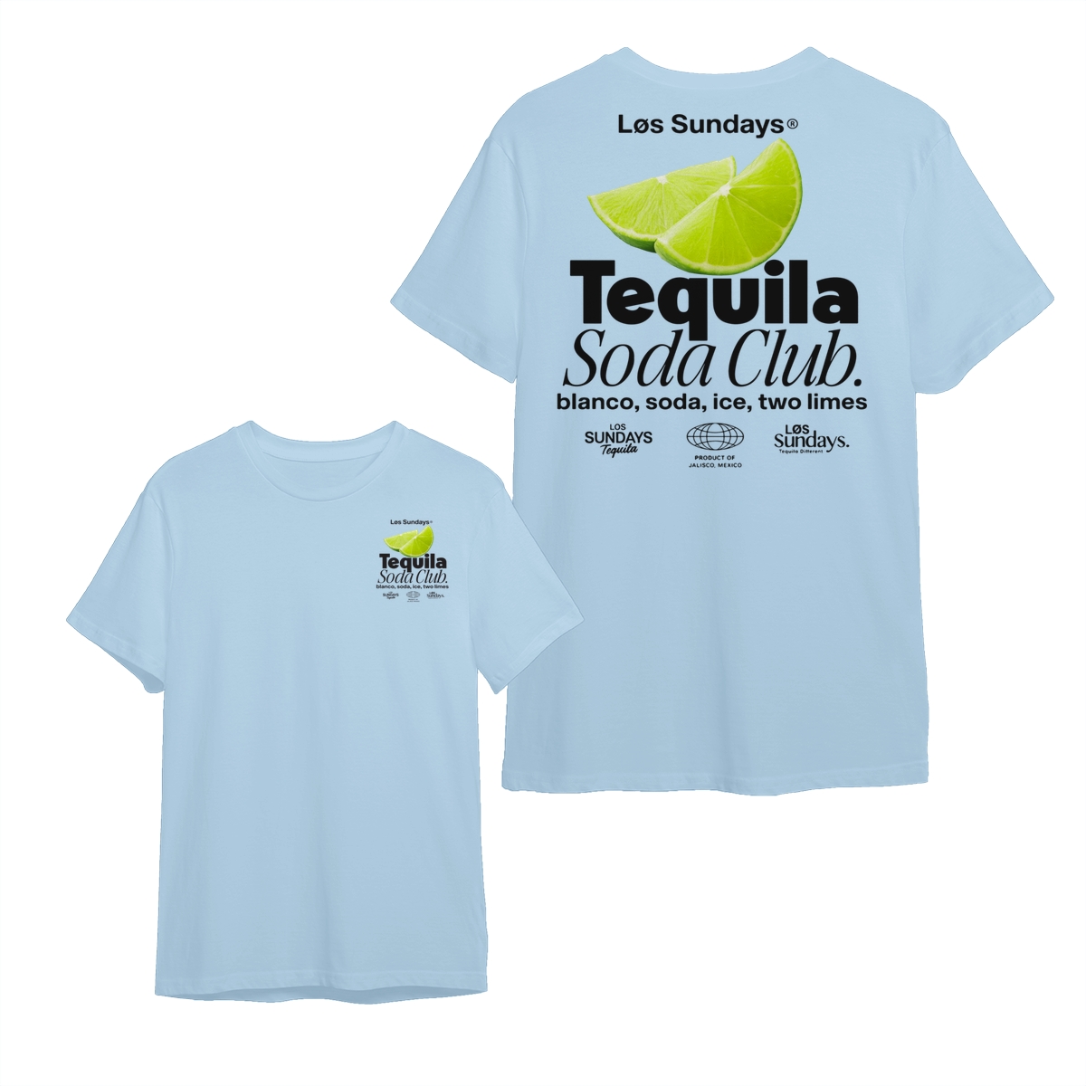 Tequila Soda Club Tee with Lime, Blanco, Ice Text Design, 2-Sided Los Sundays Graphic, Soft Cotton Blend, Casual Summer Party Shirt for Men & Women.