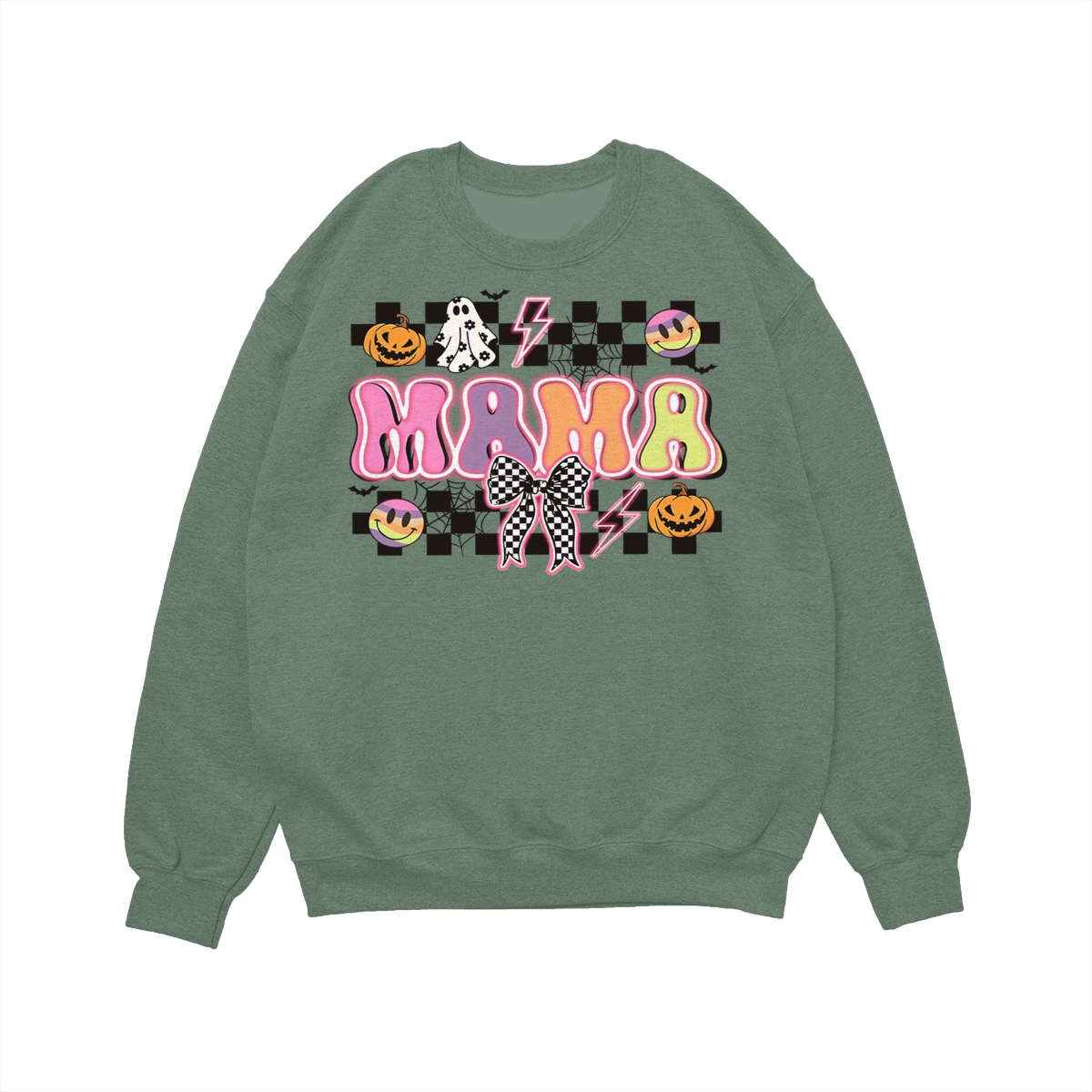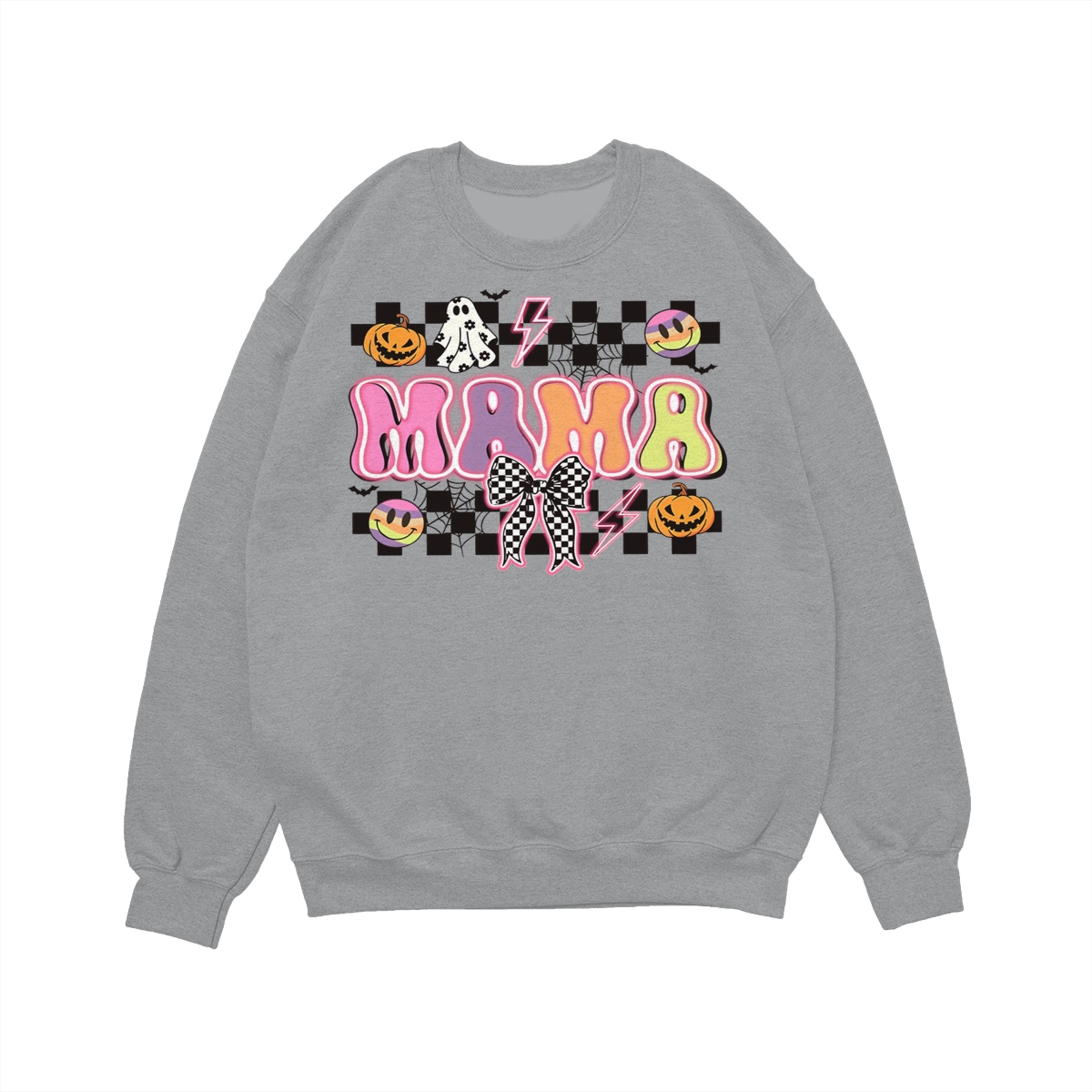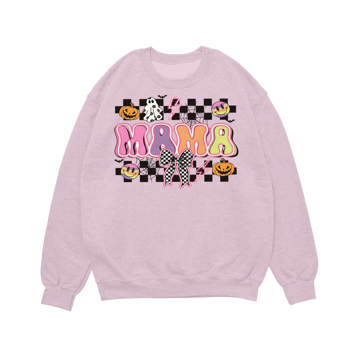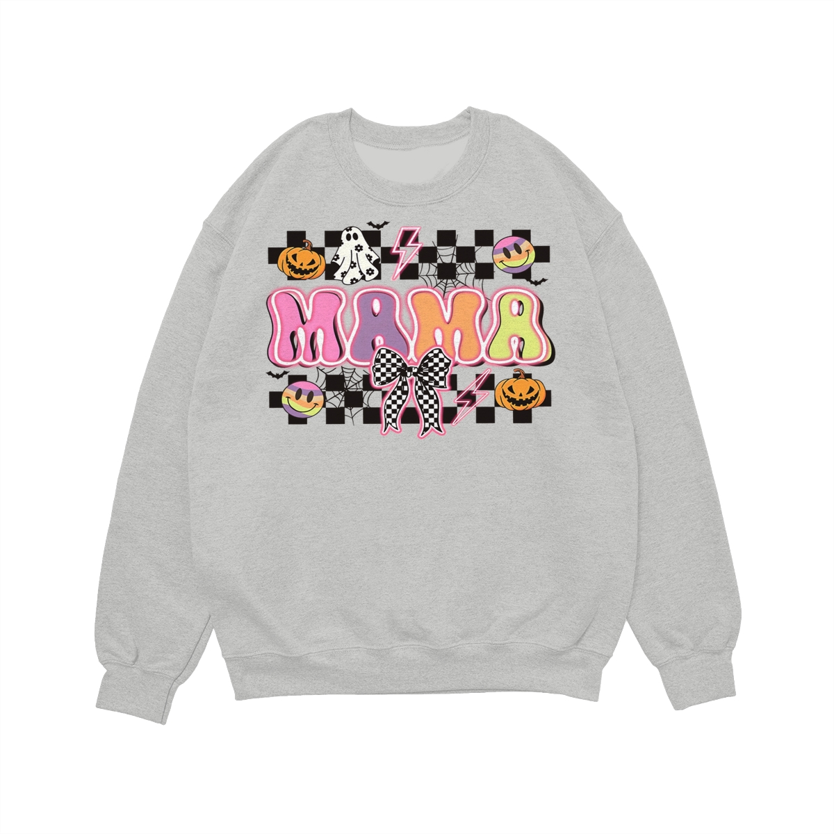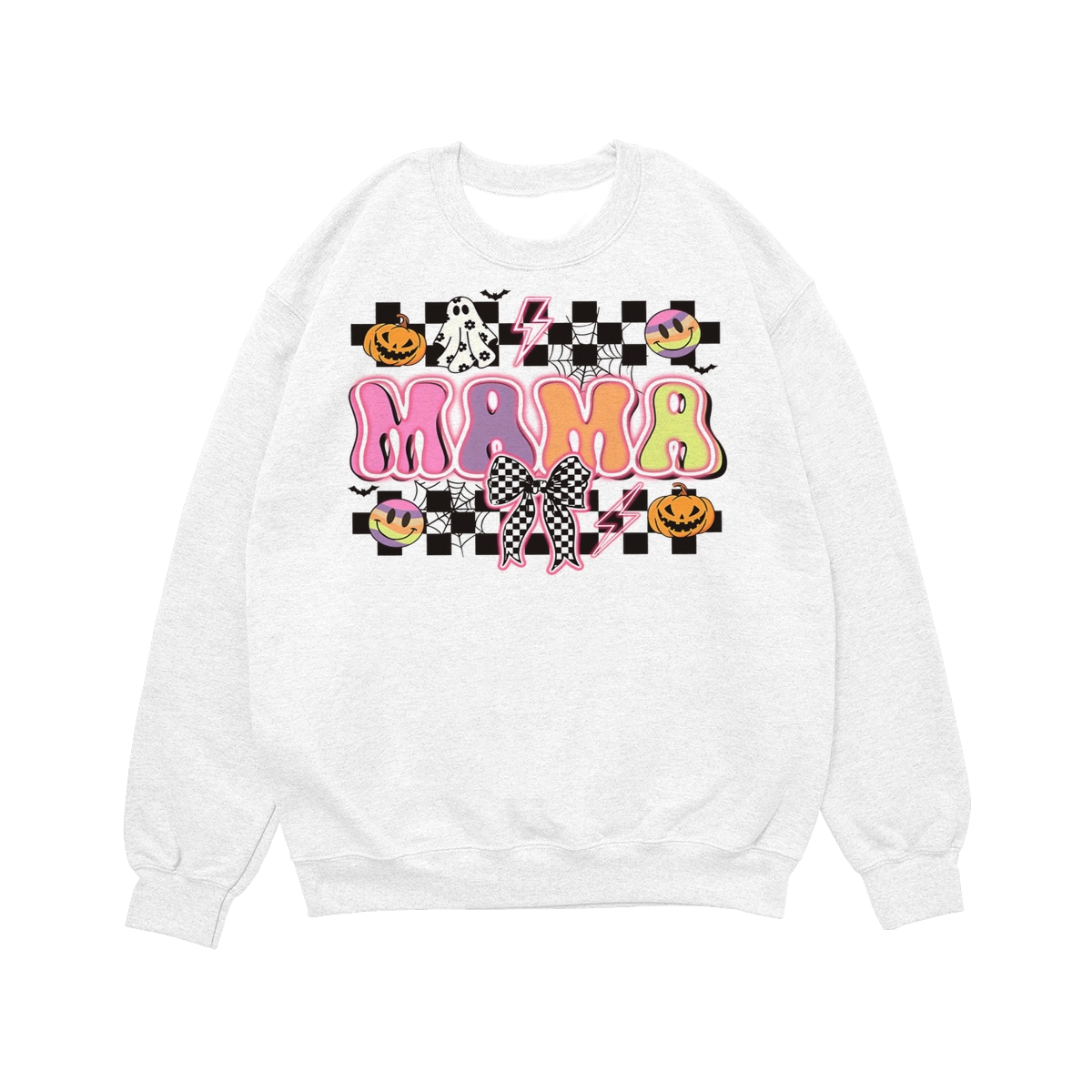 Trendy Spooky Mama – Cute Retro Halloween Checkerboard Unisex Crewneck TShirt/Sweatshirt/Hoodie – Printed in the USA, TikTok Viral Mom Sweatshirt, Kawaii Spooky Vibes, Pastel Halloween Gift for Mama
