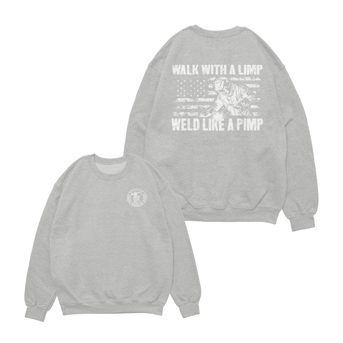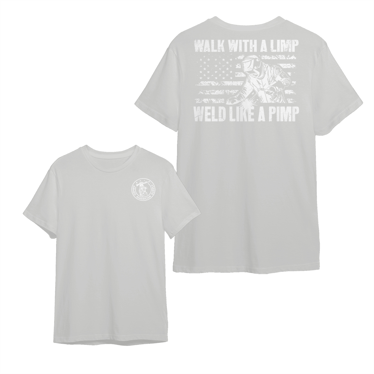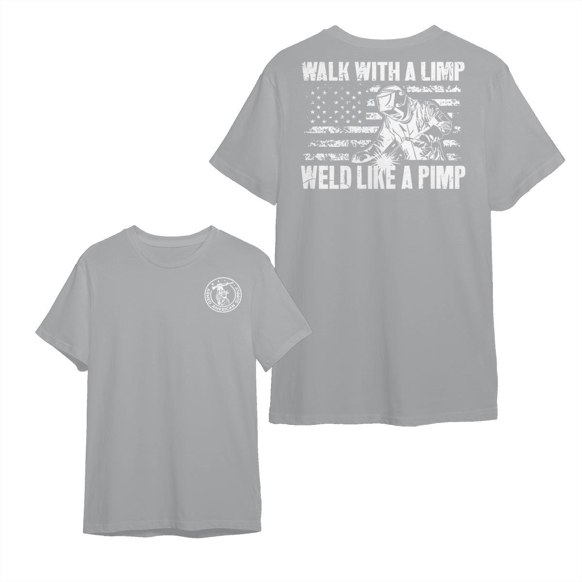 Welding Graphic T-Shirt – “Walk with a Limp, Weld Like a Pimp” Funny Patriotic Welder Tee, Unisex Fit, Gift for Blue Collar Workers & Metal Fabricators, Streetwear men gifts unisex top perfect shirt Casual Crewneck