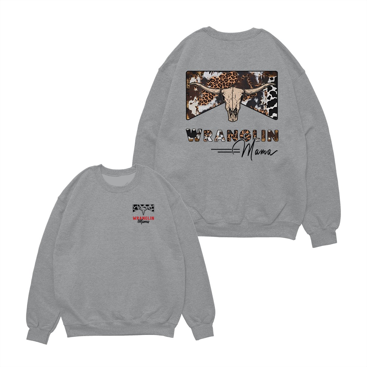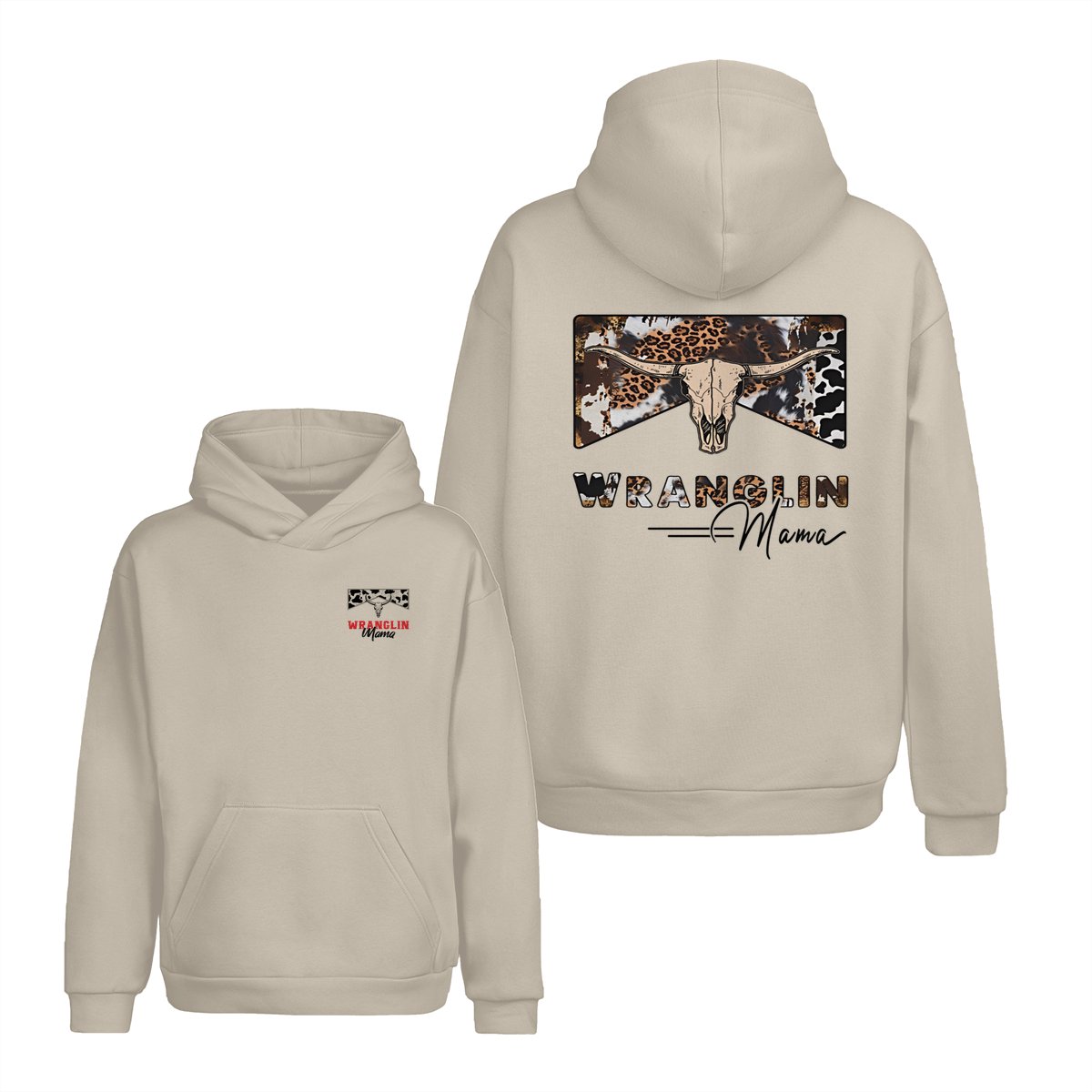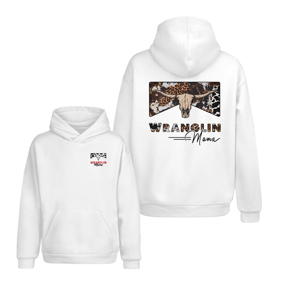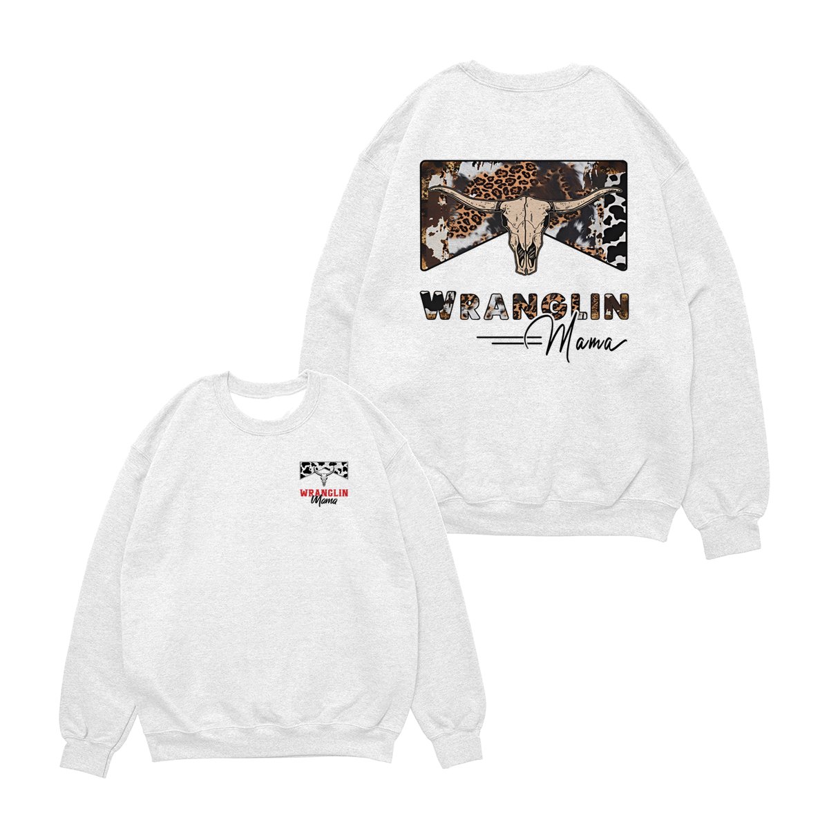 Wranglin Mama TShirt/Sweatshirt/Hoodie – Western Cow Print & Leopard Skull Graphic, Country Girl Gift, Cowgirl Style Sweatshirt, Boho Western Mama Pullover, Trendy Ranch Life Hoodie for Women
